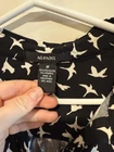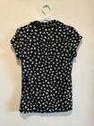 This is a stylish Alfani top for women in a size medium and black color. It features a charming bird print design on a knit polyester blend fabric with a collared neckline and cap sleeves. The pullover closure is accented with buttons, making it easy to wear. This blouse is suitable for various occasions including travel, parties, casual outings, and even formal or business settings, offering a versatile and chic addition to any wardrobe. Perfect for summer, fall, and spring seasons, this blouse combines a basic style with artistic and bohemian themes. 123a