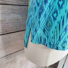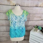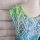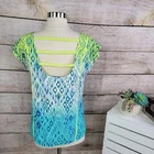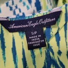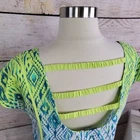American Eagle Cap Sleeve Neon Geometric Blue Green Open Back Top Size Small Back Elastic Open Ladder Elastic Cut Outs Neon Geometric Piping Details Capped Short Sleeves Side Slits Excellent Pre-Owned Condition 100% Polyester