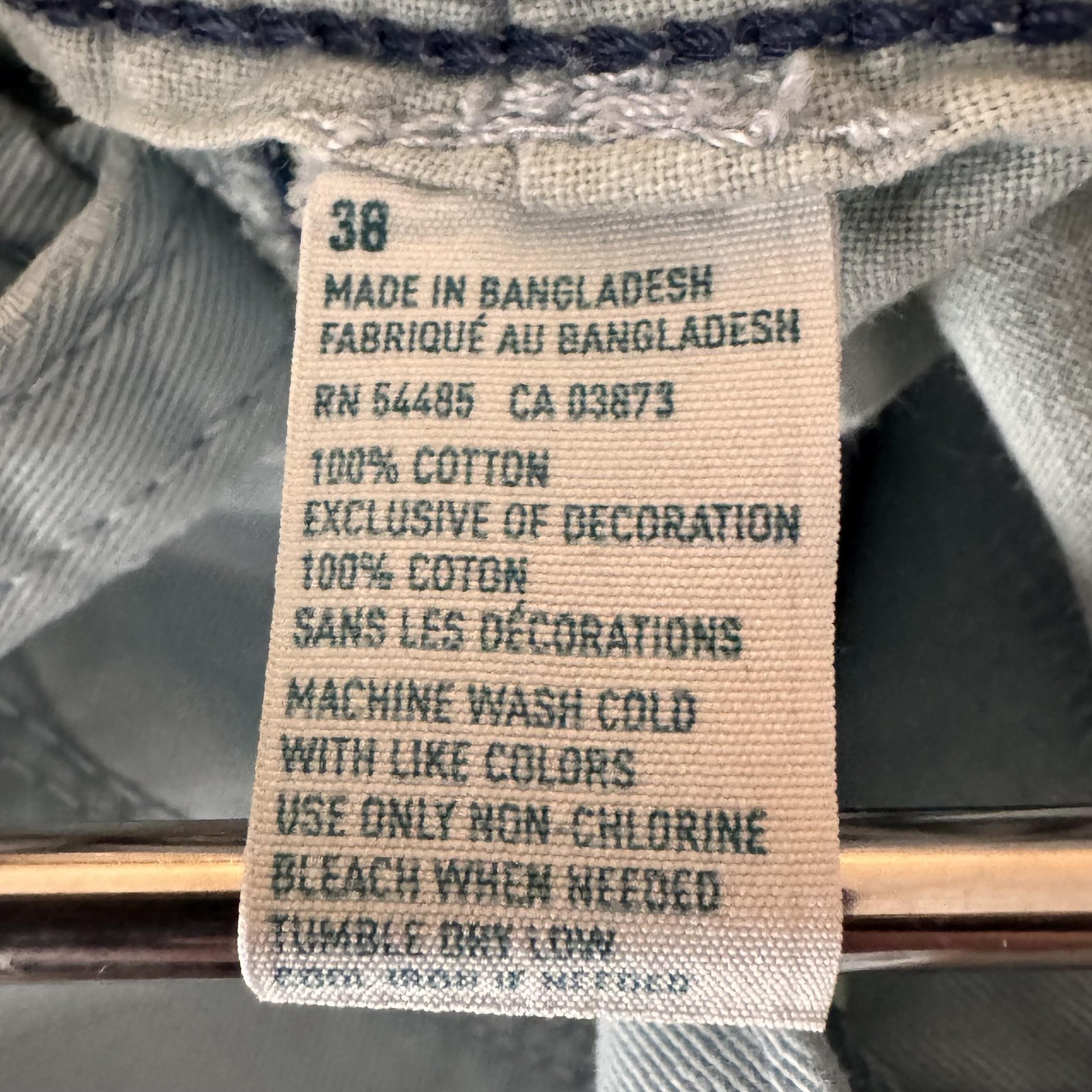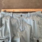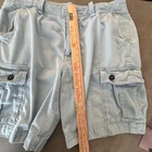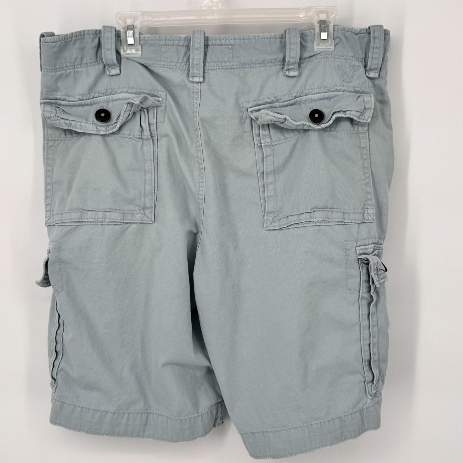 Brand: American Eagle Outfitters Item: Mens classic length cargo shorts in a light blue solid color. Size on tag: 38 (mens regular fit). Material: 100% cotton soft woven twill fabric. Country of origin: Made in Bangladesh; RN 54485; CA 03873. Interior label details: AEO code -627406637, 03/12, 5659. Details: Zip fly with button closure, belt loops, front slant hand pockets, dual cargo pockets with button-flap closures on both legs, back flap pockets with buttons, and tonal embroidered eagle logo near the side pocket. Classic casual cargo short style suitable for everyday wear, travel, or outdoor activities.