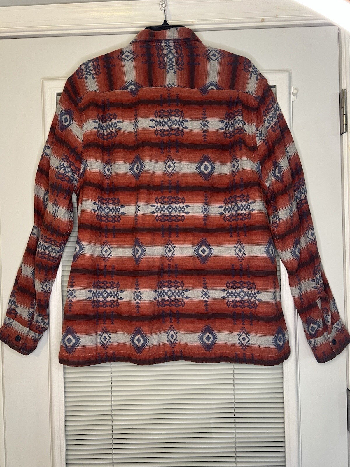 This American Outdoor Co. True Grit Southwest Shirt Jacket Shacket in size XL is perfect for any occasion, whether it be for travel or casual wear. Made with flannel fabric and a cotton lining, this jacket is both comfortable and stylish. It features a button closure, band collar, and pockets for added convenience. The multicolor pattern and Aztec theme make this jacket perfect for those who want to add a touch of Western, boho, or southwestern style to their wardrobe. It is machine washable and easy to care for. The jacket is a regular fit and has a chest size of 44 inches. Don't miss out on this unique and fashionable piece!