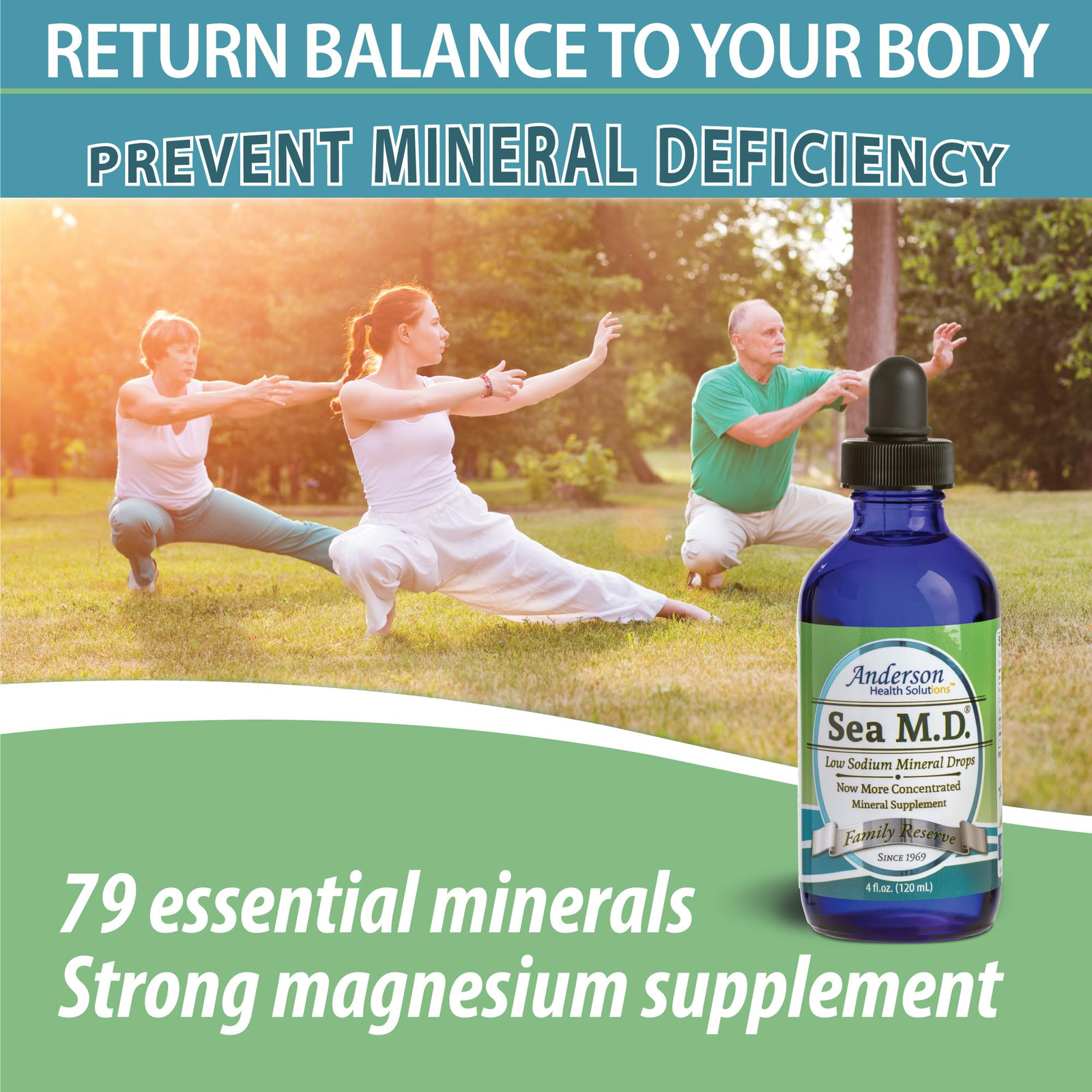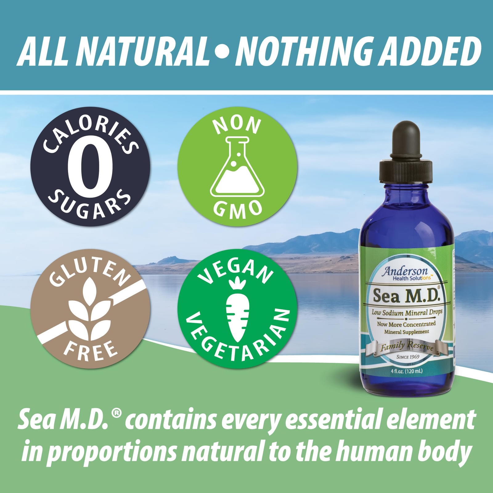 Original, Pure, Natural - Ionic, electrolyte, magnesium-rich Anderson Sea MD is the low-sodium sea mineral formula from Utah’s Great Salt Lake. Used by millions world wide, it is simple and natural - just solar evaporated, concentrated sea water Highest in Magnesium; Lowest in Sodium; Easy to Use - 220mg of magnesium and just a trace of sodium, Sea MD contains 79 trace essential minerals. Recharge with 1-2mL per day in your water, coffee, even food. Experience Relief and Results - Once your body returns to optimum levels of minerals, you will feel a palpable difference. Magnesium supports bone/joint and cardiovascular health; it aids in ”charley horse”; and benefits mood regulation, good sleep and digestive regularity. Remineralize Filtered Water - Anderson’s Sea M.D. is used by many to put back the essential minerals taken out by using a Brita or other filtering system. Strong Taste Undiluted; Perfect Concentration - Anderson’s Sea M.D. has a strong flavor when undiluted. Some folks enjoy it; however, using several drops in a glass of water or 1 mL dropperful in a 24-36 ounce flask will render the solution flavorless.