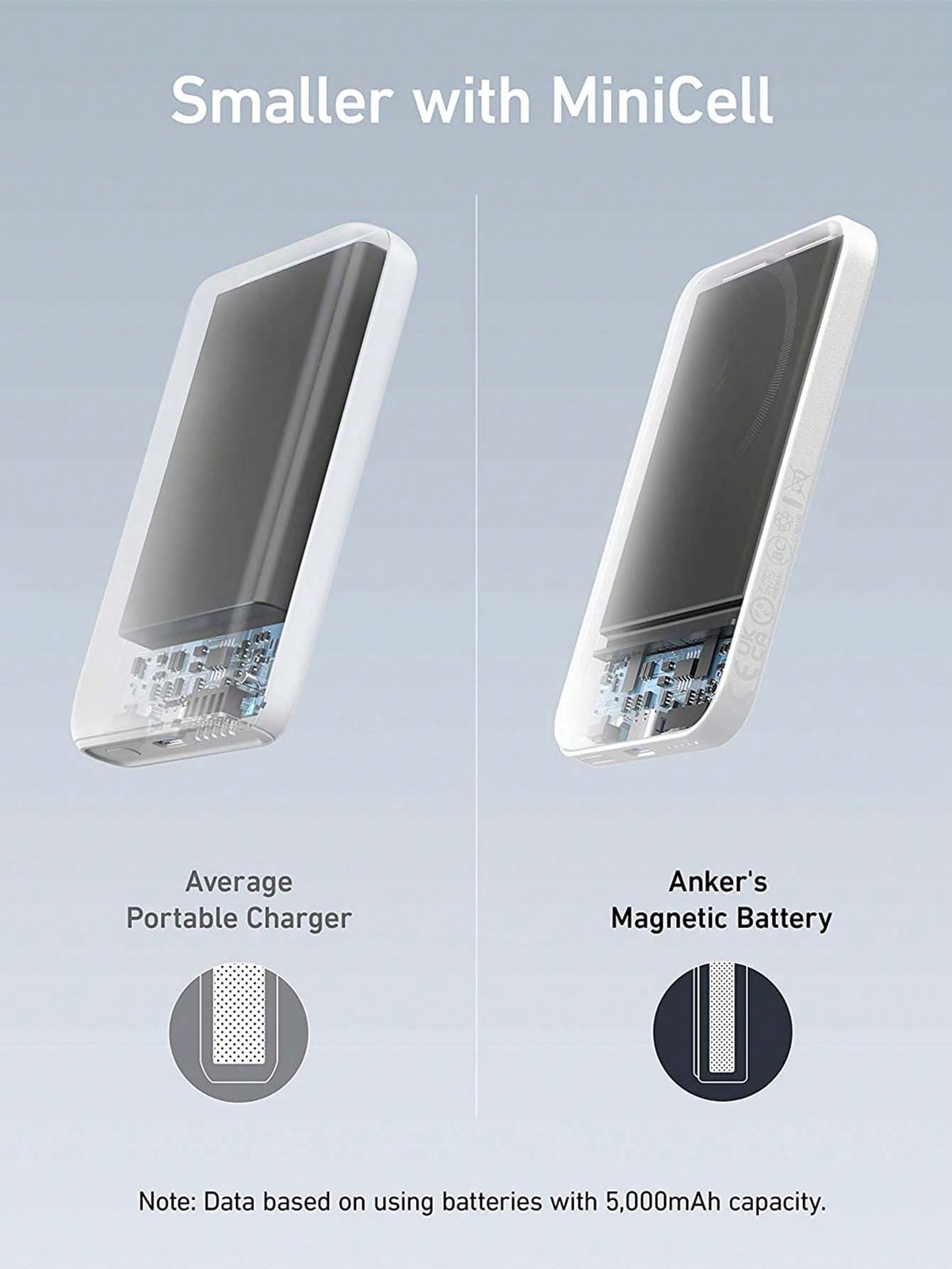 Smaller Than Ever: Anker's new MiniCell technology delivers identical charging performance with fewer components. This means it's smaller and lighter than ever before. Pocket-Sized Power: Slim enough to snap to your phone and slip into your pack, purse, or pocket. Strong Attachment: Equipped with ultra-strong magnets that firmly attach to the back of the iPhone 13 or 12 so you can single-handedly take selfies, make calls, and more. Charge in a Snap: Align your iPhone and battery with a snap. Say goodbye to disconnection issues caused by wireless charging misalignment.