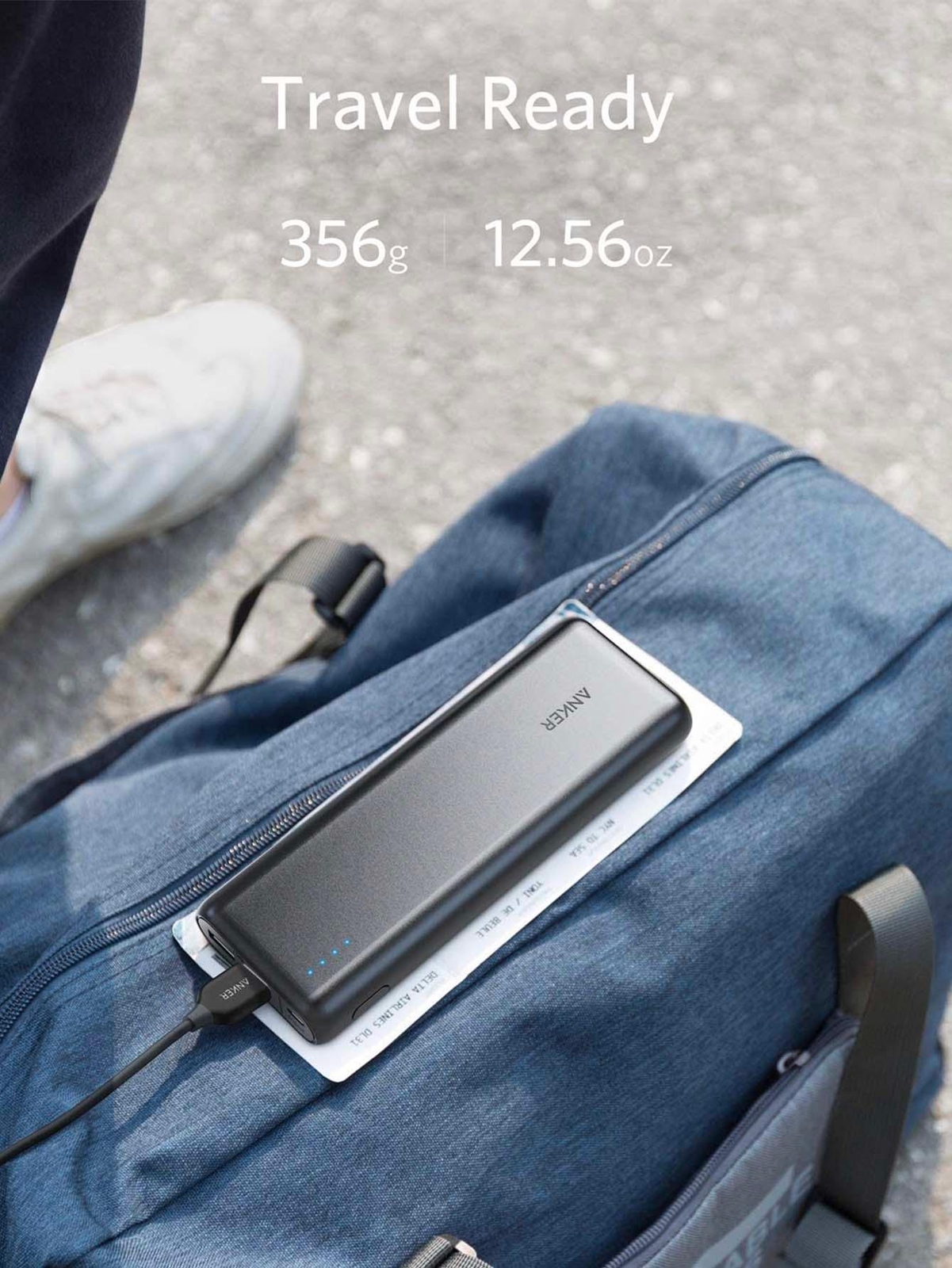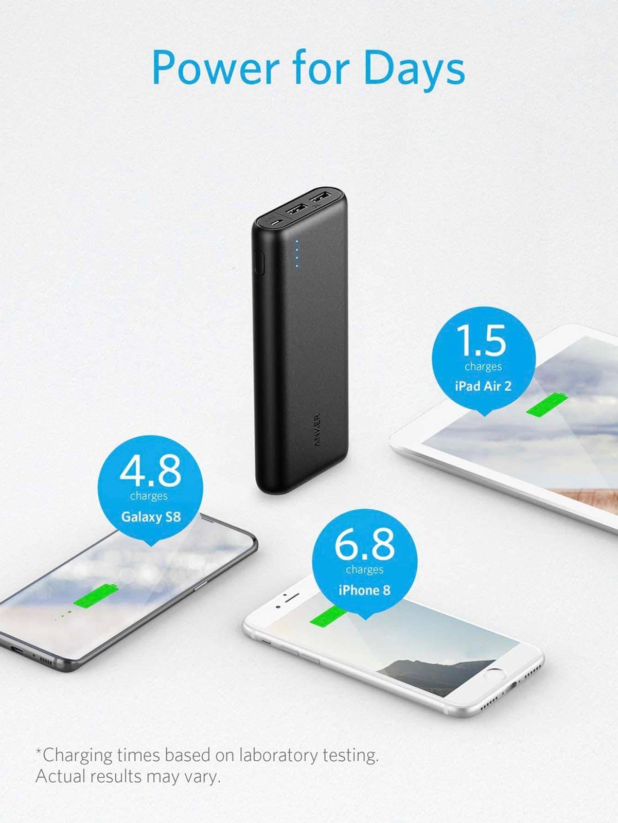 The Anker Advantage: Join the 50 million+ powered by our technology. Ultra-High Capacity: Weighs as little as a can of soup (12.5 oz) yet charges the iPhone 8 almost seven times, the Galaxy S8 five times or the iPad mini 4 twice. Certified Safe: Anker’s MultiProtect safety system and highquality battery cells ensure complete protection for you and your devices. What You Get: Anker PowerCore 20100 Portable Charger, Micro USB cable, welcome guide, 18-month warranty, and friendly customer service; USB-C cable (to charge the power bank) and Lightning cable for iPhone / iPad sold separately. Ultra-High Capacity Enough power to keep you going for days. Charge an iPhone 8 almost seven times, a Galaxy S8 five times or an iPad mini twice. High-Speed Charging Technology Exclusive to Anker, PowerIQ and VoltageBoost combine to ensure your devices charge at their fastest possible charge speed. Does not support Qualcomm Quick Charge. Enormous 4.8A Output Industry-leading output of 4.8 amps provides enough power to simultaneously charge any combination of devices at full speed. MultiProtect Safety System Surge protection, short circuit protection, and more advanced safety features keep you and your devices safe. Matte Finish Enhances grip and prevents smudges and fingerprints. What’s In the Box: PowerCore 20100 Portable Charger Micro USB cable Welcome Guide For Optimal Use: • Use the included cable, your original cable, or a third-party certified one (such as MFi); AC adapter not included. • Please use your original Apple charging cable (not included) to charge Apple products. • Compatible with most USB-charged devices, including iPhone 8 / X / XS / XS Max / XR (Lightning cable required), Android smartphones and tablets (including the Nexus 7), and iPads. • Not compatible with the iPod nano, iPod Classic; Not for devices with an input below 50mA (e.g. some Bluetooth headsets and GPS devices). Note: • The power bank is flight-approved and allowed on a plane.