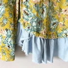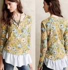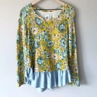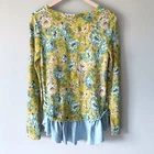Lilka for Anthropologie Goldenrod Ruffled Long Sleeve Top in floral print. Size medium. Gold/mustard color. Chambray blue ruffled hem. Embroidered details at collarbone and wrists. Scoop neck. Medium weight. Retailed for $98. Pre-owned, excellent used condition. All measurements are approximate, not exact. Length: 25-29” Pit to pit: 18” measured flat Sleeve length: 19”