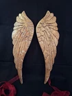 Timeless and etheral...these Gilded wings GLOW! Handcarved pair with Gilded finish each wing is 2 foot long by 2 inches. TOTAL 26 INCHES EACH. 8 INCHES AT WIDEST PART DOWN TO 2 INCHES AT BOTTOM. Very good pre-owned condition with marks consistent with a vintage item. Please review photos. Red silk ribbon can be left or easily removed. Beautiful decor pieces for every season. UPS SHIPPING