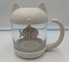 This is a cute glass cat mug (his head is the lid to the cup and the tail is the handle) with an infuser for tea in the shape of a fish. It is a beige color and clear glass and will hold about 8 ounces. I am a careful and thorough packer, but for some of the items I sell, I’m not able to use combined shipping because of their size or propensity to break if put into a box with other items. If you purchase more than one item from my store and ask for combined shipping, I will do my best to accommodate your request. I will accept any reasonable offer so please feel free to send your offer. T hank you for visiting my store. I hope to see you again soon!
