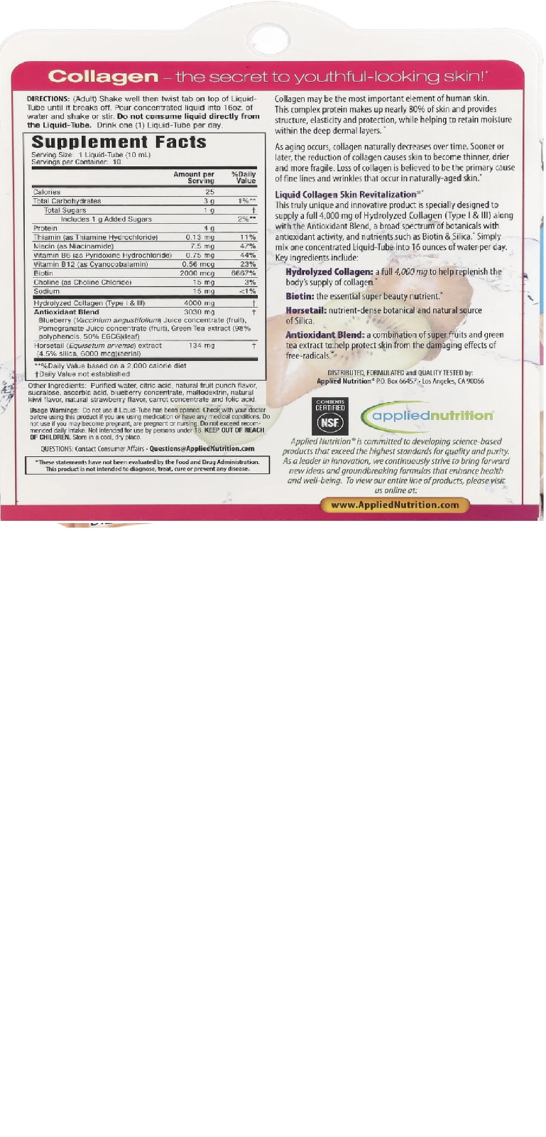 About this item Liquid Collagen Skin Revitalization®* is a truly unique and innovative product specially designed to supply a full 4,000 mg of collagen along with the Antioxidant Blend, a broad spectrum of botanicals with antioxidant activity, and nutrients such as Biotin & Silica.* Simply mix one concentrated Liquid-Tube into 16 ounces of water per day. Key ingredients include: Hydrolyzed Collagen : a full 4,000 mg to help replenish the body’s supply of collagen.* Biotin : the essential super beauty nutrient.* Horsetail : nutrient-dense botanical and natural source of Silica. Antioxidant Blend : a combination of super fruits and green tea extract to help protect skin from the damaging effects of free-radicals.* *These statements have not been evaluated by the Food and Drug Administration. This product is not intended to diagnose, treat, cure or prevent any disease.
