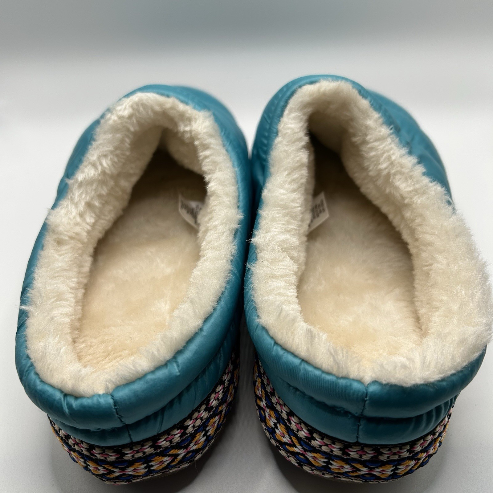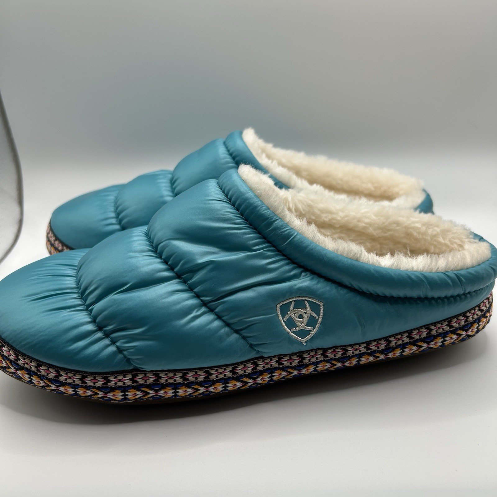 The Ariat Women's Indoor/Outdoor Crius Clog Slippers in Turquoise with Sherpa Lining are designed for comfort and style. These slip-on slippers feature a solid blue color with a faux fur insole for added warmth. Perfect for casual occasions, the nylon upper and rubber outsole make them durable for both indoor and outdoor wear. The design includes a slipper/clog style with a Sherpa lining, making them a cozy choice for all seasons. Made by the trusted brand Ariat, these slippers combine practicality with a touch of outdoor-themed accents.