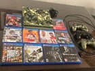 Super Great Buy for the holidays! Army Fatigue colored console with three controllers and 10 PS4 games. Games include: Madden 23, 22, 21, 20, Grand Theft Auto 5, Assassins Creed 4, Skyrim, Mortal Kombat XL, W2K20, and Drive Club. Game console works. Scratches on top surface of console, small crack at ps4 right side port, and back panel slightly loose on back side of console.