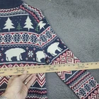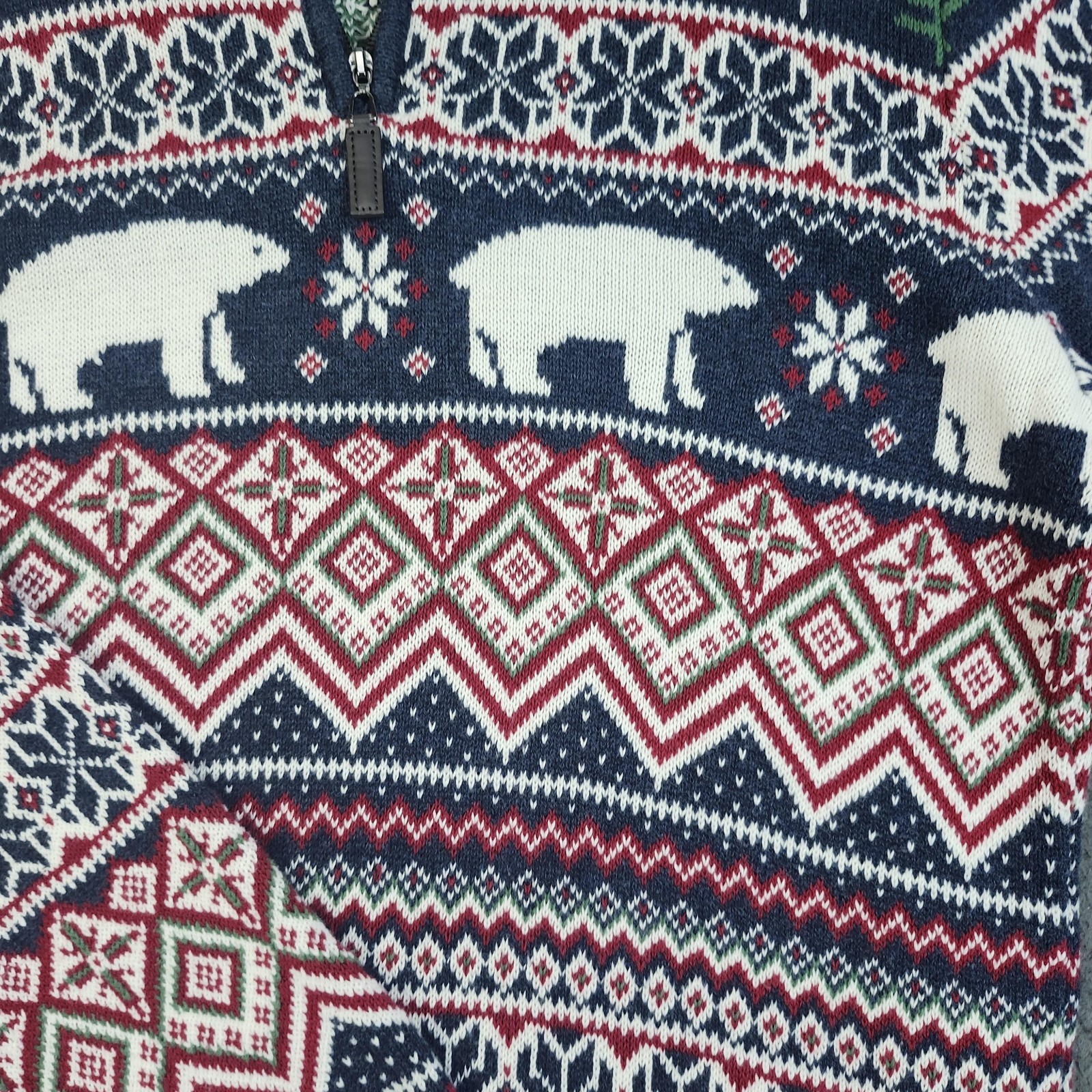Brand: Aspen Style: Mens knitted sweater with mock neck and quarter-zip front. Color: Navy blue base with white, red, and green accents. Design: Fair Isle / Nordic pattern featuring polar bears, evergreen trees, snowflakes, and geometric motifs across the body and sleeves. Size on tag: Medium (US M, CA M/M, UK M, EU M, AU M). Country of manufacture: Made in China. Details: Ribbed collar, cuffs, and hem for a snug fit; metal zipper pull at neckline; cozy holiday and winter theme suitable for casual or festive wear.