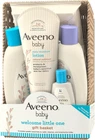 roduct Description Aveeno Baby Welcome Little One Gift Basket with four skin care essentials specially formulated with oats for baby's delicate skin & hair. For parents & parents-to-be, this baby gift set includes baby wash & shampoo, calming bath wash, cleansing wipes & daily moisture lotion. Aveeno Baby Daily Moisture Wash & Shampoo has a tear-free, hypoallergenic formula that cleanses baby's hair & sensitive skin without drying, making it gentle enough for daily use. Aveeno Baby Calming Comfort Bath & Wash has soothing scents of lavender & vanilla to help relax baby before bedtime so they can experience a more restful sleep. Perfect for on-the-go, Aveeno Baby All Over Wipes with aloe & oat extract gently clean & leaves baby’s face, bottom, hands & body feeling moisturized. Aveeno Baby is a pediatrician & dermatologist recommended brand. Product details Product Dimensions : 6.5 x 8.5 x 9.25 inches; 3.5 Pounds Item model number : 111887802 Date First Available : June 10, 2022 Manufacturer : Kenvue Country of Origin : USA