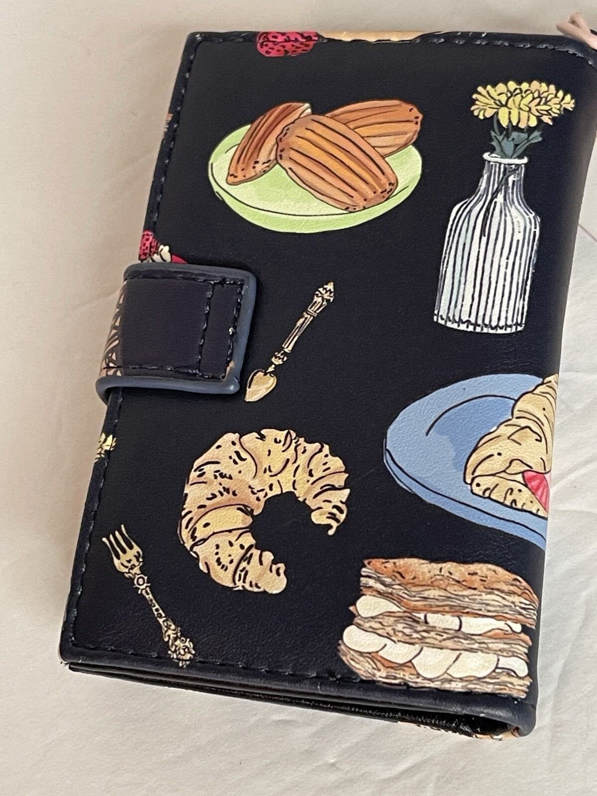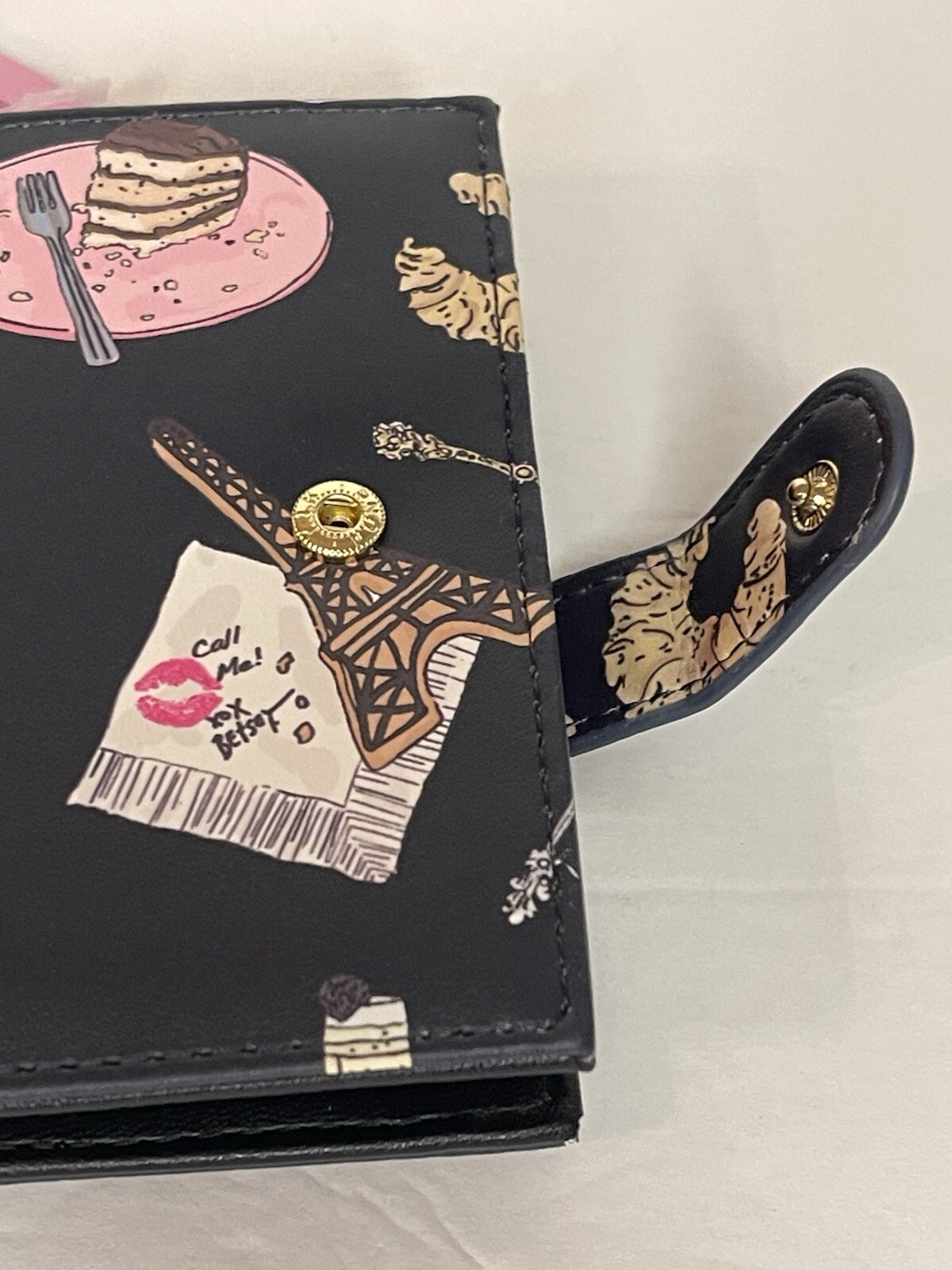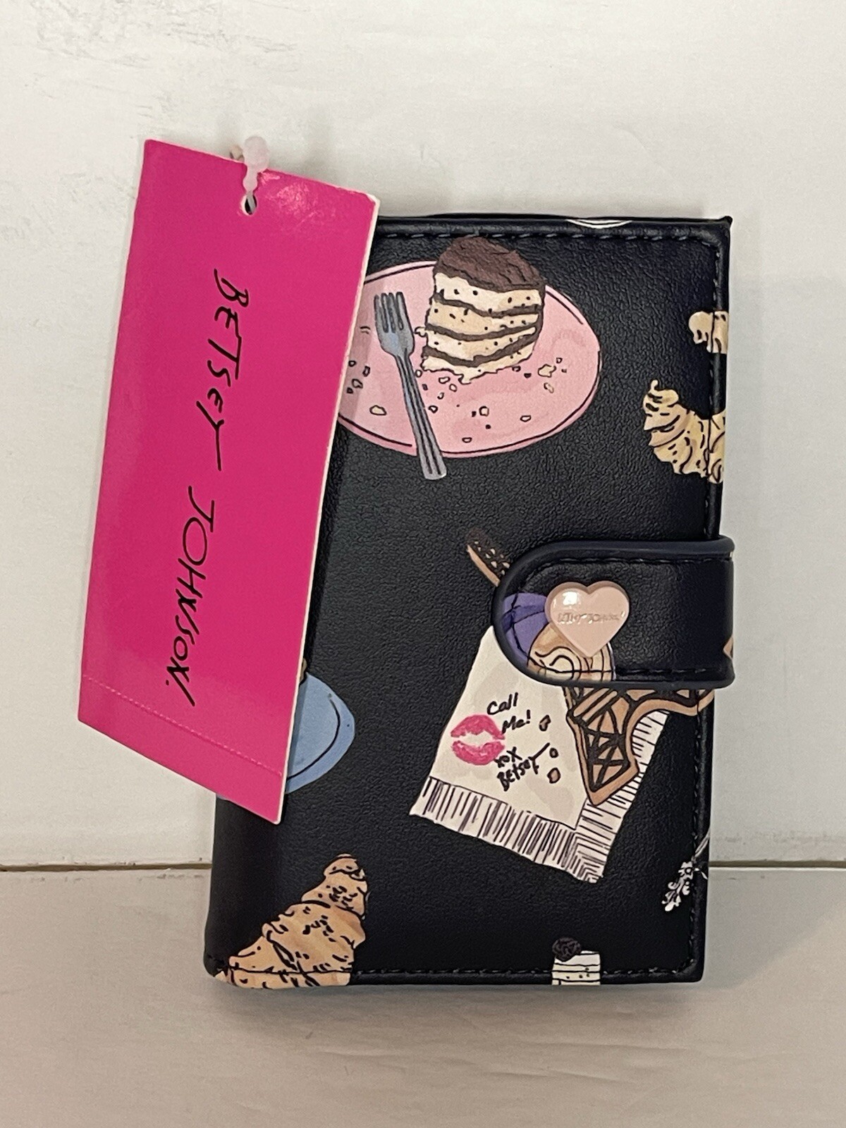Betsey Johnson Charcoal Card Case Wallet W/ Key Ring French Desserts Print NWT