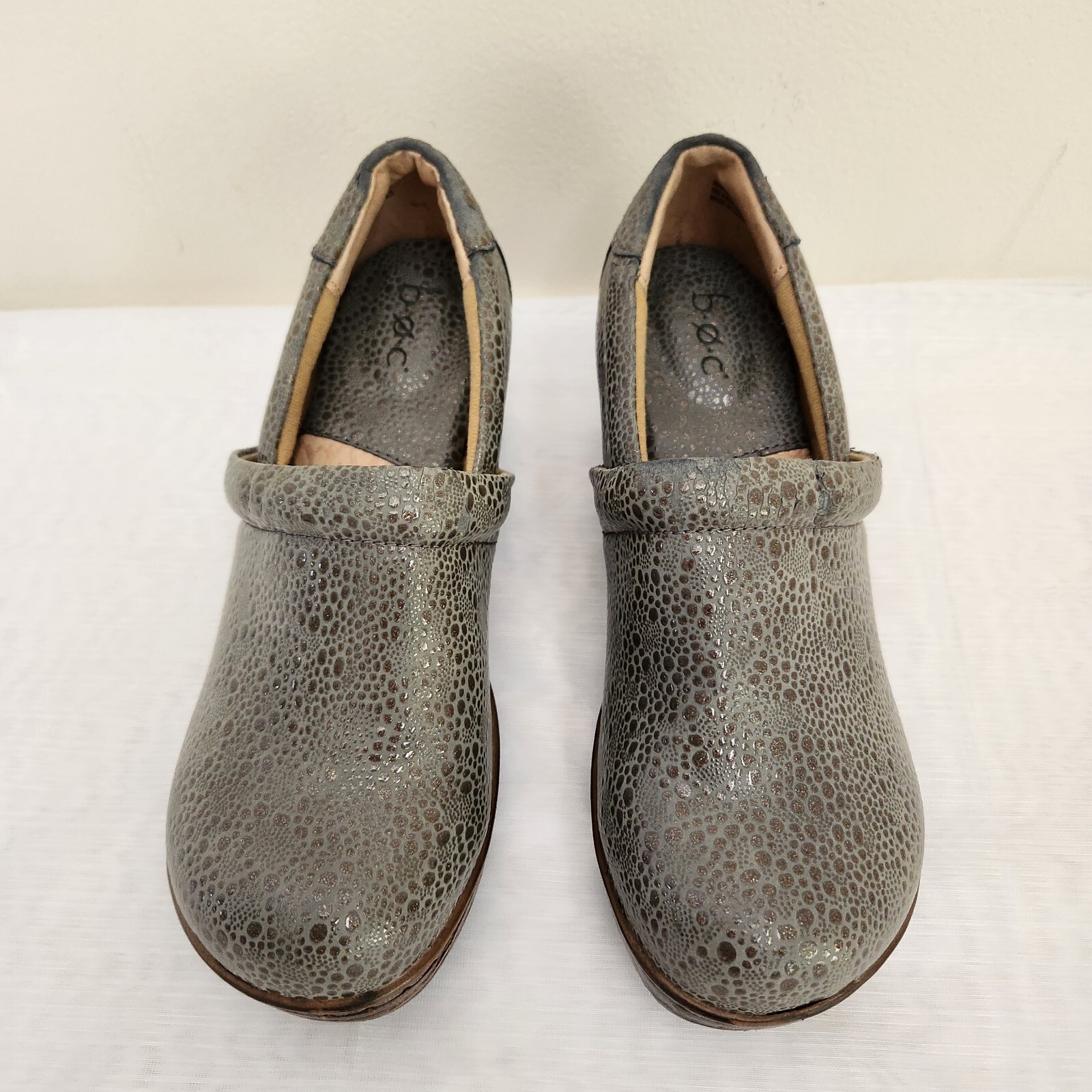 BOC Born Concept Clog Womens 8 Gray Peggy Embossed Pebble Slip On Shoe Boho Chic - Pre-Owned in Very Good Condition - Measurements Heel Height - 2 1/4 in - Returns acceptable within 30 days of purchase unworn, in original condition - Check out my E-bay Store. Lots of Choices Available. Reduced shipping for 2 or more items. Let me know before you pay so I can send you an invoice to discount the shipping