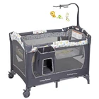 Product Description The Baby Trend Nursery Center Playard is gender neutral and fun, perfect for any home or nursery setting. This Playard is featured with a removable full bassinet, a mobile with three adorable plush toys, and a diaper stacker for baby's essentials. Ideal for keeping your child entertained and happily occupied, you can have peace of mind as you tackle household chores. Lightweight and portable, this Playard comes with a travel tote bag so you can easily take it on trips to the park or beach. The one-hand locking mechanism allows you to easily open or close the portable Playard and the two large wheels with brakes provide greater mobility and stability. This Baby Trend Nursery Center is designed for children under 35 inches tall and weighing less than 30 lbs.