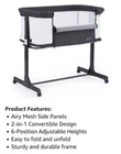 NEW in Original Box 2-in-1 Bassinet & Bedside Sleeper Color: Charcoal Gray From the Manufacturer: Use as a stand-alone baby crib or easily convert into a bedside sleeper with unzipping and unrolling side wall Securely attach to adult size bed with included safety straps, 6 different height positions, 2 mesh side pockets Includes waterproof mattress pad, cotton fitted sheet, and bedside straps. Covers are machine washable Sturdy aluminum frame and durable fabric, 4 wheels with brakes Easy Assembly