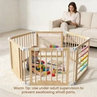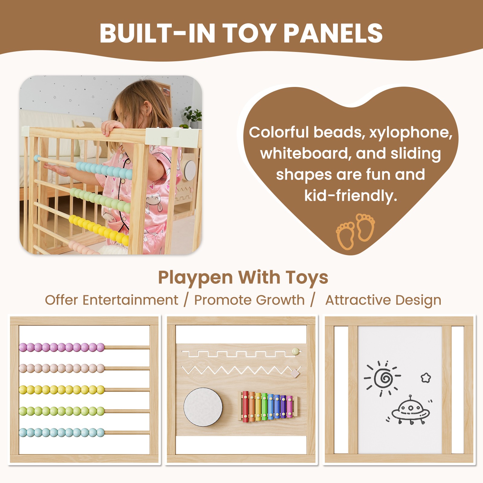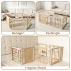 High-Quality Premium Baby Playpen: Our playpen is crafted from high-quality, natural pine wood, meticulously selected and polished to ensure a smooth surface. Provide a place for your child to play Interactive Play Panels for Enhanced Fun: Montessori-inspired baby play yard features three engaging activity panels designed to spark your child's creativity. From drawing and path-tracing games to drums, abacus, and musical scales, each panel offers a unique play experience Adjustable Shape for Use: The wooden playpen is designed to adapt to your child's needs. With its modular panels, you can easily configure it into various shapes like octagons, squares, or rectangles. This flexibility ensures your child has the perfect space to play, learn, and grow Enhanced Stability: We include four additional white baffle to secure the playpen, preventing any unwanted movement. This added stability ensures the enclosure remains sturdy while your child plays and explores, giving you peace of mind Quick and Easy Assembly: Wooden play yard incredibly easy to assemble. Easy to store and move quickly, ideal for nursery, living room or vacation. The straightforward setup process allows you to focus on spending quality time with your child