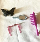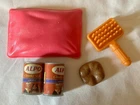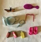 Barbie/ Fashion Doll Beach Accessories, Swimming Suits, sandals, sun glasses, lotion bottle, bag, book, hair brush and butterfly hair clip Dog Accessories, dog bed, brush, food and canned Alpo food Lot of 16 Previously Owned Good usable condition See photos for details and condition