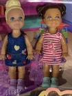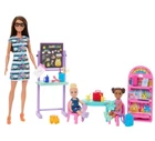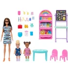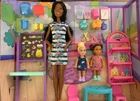 Barbie I Love School Doll HRG84 with redressed African American Barbie as the teacher. The Teacher doll was redressed and reattached to the packaging. Barbie doll's I Love School classroom playset is filled with so many possibilities and ways to play! With more than 20 pieces including a teacher Barbie doll, two toddler dolls, a chalkboard, shelf, table, and chairs, kids can create the perfect classroom set up. Imaginations are stocked with all the school supplies needed to ace playtime with accessories like pencils, scissors, glue, books, toys, and more! Dolls cannot stand alone.