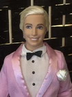 Doll Stand and certificate of authenticity included. Doll never played with only redressed. Introducing the Barbie The Movie Ryan Gosling Ken Denim Doll Redressed in a 2 piece Tuxedo with. pink jacket, black dress shoes. This fashion doll is a must-have for any Barbie collector or fan. The doll features platinum blonde hair, blue eyes, and a light complexion. Ken is perfect for any party occasion. This original, 11 inch Barbie Collector doll is a licensed reproduction from the franchise. Don't miss out on the chance to add this stylish Ken doll to your collection! Pet free, smoke free home.