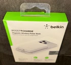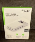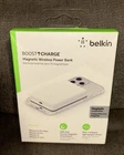 Belkin Wireless Power Bank w/MagSafe Compatible 7.5W Wireless Charging - Portable Magnetic Charging Bank - Compatible w/iPhone 15, 15 Plus, 15 Pro, 15 Pro Max, iPhone 14, AirPods, & More - White. This Belkin MagSafe BOOSTCHARGE Magnetic Wireless Charging Power Bank takes full advantage of MagSafe technology. MagSafe technology is changing the charging game. Using the MagSafe feature of your Apple iPhone lets you snap any iPhone 15, iPhone 14, iPhone 13 or iPhone 12 Series Device magnetically into perfect alignment and a quick, easy power boost. The perfect magnetic alignment allows you to continue scrolling or streaming while you charge, and a slim, portable design fits easily in your purse or pocket. When the power bank needs a recharge, pass through power allows you to plug it in while still powering your phone, so you never have to wait to charge. MAGSAFE TECHNOLOGY ON THE GO: Achieve a quick magnetic power boost for your Apple iPhone. Align this portable charger power bank to your iPhone every time thanks to MagSafe compatibility. VERSATILE POWER: With a capacity of 2500 mAh, this battery pack provides an iPhone 14 a quick boost up of to 25% power in 50 minutes. DURABLE AND TRAVEL READY: Our portable chargers are designed with durability and portability. A slim, portable design allows you to easily slip the power bank into your purse or pocket. UNINTERRUPTED CHARGING: Keep charging your iPhone even when the power bank itself needs recharging, thanks to pass-through power technology. LED INDICATOR LIGHT: An LED light tells you the power bank’s status, so you always know when it’s time to recharge. Condition is brand new, sealed in original packaging. Shipped USPS ground advantage package.
