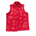 Bfofo brand red 100% cotton vest has orange pictograph designs on the front & back. Made from sweatshirt fleece-type fabric. Unique silver-tone button front closures have a Kokopelli design. Women's size "medium" - see below for garment measurements. Pre-owned condition: cotton fabric has some fading from normal wash/wear. The pictures show the actual item that you will receive. Garment size when laid flat: Bust: 22" (up to 44" bust) Waist: 21" (up to 42" waist) Hip: 22" (up to 44" hips) Length measured from shoulder to bottom of hem: 27" Ships from Alberta, Canada. Tax applies to purchases.