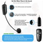 Wireless microphone headset system: Only for Mic Jack, not Aux Jack, otherwise no sound ●Built-in high sensitivity condenser microphone, transmission distance upgrade to 160 Feet (50m) ●Signal Stability●No Delay●No Radiation ●Anti-Howling ●Anti-Jamming ●Constant Frequency ●Clearer Sound Quality. Compatible voice amplifiers, multimedia. It is a portable Karaoke equipment.(Excludes Amp&Not supported Iphone, bluetooth speaker, PC and Laptop) ●Obtained by FCC test. Easy to use: Please turn on the transmitter and receiver power switches, the blue light will flash for approximately 2s. Indicator light stops flashing after a successful match, then you can use it. No further operation. ●Headset and handheld is 2 in 1 design, easily change the handheld mode to headset mode to meet your needs. Not supported Android Phones, Iphones, Macbooks, Laptop, Bluetooth Speaker. Charge and work of wireless microphones: The transmitter and receiver are built-in 400 mah rechargeable lithium-ion batteries that can offer about 6 hours working time. ●Usb cable has two micro USB V2.0 to charge for the transmitter and receiver simultaneously. Fully charge is only 2.5 hours. ●Perfect Application: The plug on the receiver is 3.5mm. For 6.35mm amplifiers, please use the additional 6.35mm adapter(included)to connect more equipments. Using multiple wireless microphone simultaneously: Please refer to the user manual to channel switching( Max 15 Channel ) in (●Part 4 Advanced Operations To 4.2 Note B, Page 8) Otherwise there maybe noise or no sound. Use up to 15 microphone headset at the same time. Built-in cardioid polar pattern condenser microphone, widely applied to conference, speech, Web podcast, outdoor Live, Yoga instructor, voice amplifier, dancing instructor, promotion, game etc. What if can't pair or no sound: ●1, Turn off the receiver and transmitter ● 2, Turn on the transmitter(Handheld Microphone), blue light is on, long press “+ ” to flash the blue light ●3, Turn on the receiver and wait for connection ●4, The blue lights of the transmitter and receiver stop flashing, the connection is successful. Product description 2023 Upgraded wireless microphone headset Not compatible with Bluetooth speakers, Android phones, iPhones and MacBooks Transmission range to160ft(50M) Enhances signal stability Reduces latency Anti-howling Anti-interference Constant frequency Clearer sound quality Transmitter and Receiver built-in 400 mAh rechargeable lithium-ion batteries 6 hours working time 2.5 hours charging time Meet the professional needs of teaching, tour guides, games, promotions, guitarists, conferences, moderators, lecturers etc. High sensitivity condenser microphone Built-in High sensitivity condenser microphone ability to clearly extract your voice 3.5mm to 6.35mm Converter 3.5mm to 6.35mm converter can adapt to more loudspeakers 400 mAh Battery Capacity 6 hours working time. Fully charging time only takes 2.5 hours. Two Type C port to charge for the transmitter and receiver simultaneously Head-mounted and hand-held Choose the headset mode or handheld mode according to your needs What if I can't Pair or not sound ? 1. Turn off the receiver and transmitter 2. Turn on the transmitter(Handheld microphone), blue light is on, long press “+ ” to flash the blue light 3. Turn on the receiver and wait for the connection 4. The blue lights of the transmitter and receiver stop flashing, the connection is successful. Use multiple wireless microphone headsets at the same time. 1. Maintain the first set can be used normally. 2. Re-pair the second set. Then long press the "-", wait for the blue light to flash quickly once( switch channel once), confirm they have no interference and work normally. 3. And so on, the third set should re-pair and switch channel three times... In order to make the wireless microphone Headset work normally, after receiving the product please charge it for 2.5 hours before using. If you need to connect to MACbook or other computers, you need Additional purchase a USB to 3.5mm TRRS converter (search on Amazon: B08P5MKXFD).