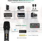 Long Distance Wireless Karaoke Microphone: Wireless Distance Upgrade To 160 Feet (50m), Upgraded the microphone manufacturing process with Signal Stability●No Delay●No Radiation●Anti-Howling●Anti-Jamming ●Constant Frequency●Distortion <0.2%●15 Uhf Adjustable Channels. ●The Mic Outer Case Is Alloy Material Which Is Harder, Lighter And More Wear-Resistant. Plug And Play, Easy To Use: ●Can Only Plug In equipment with Mic input, Can't Plug In AUX input, Otherwise No Sound.(Not Compatible with Bluetooth Speakers and Laptop)●For With Mic input Speaker, Singing Machine, Audio Amplifier, Pa System, Mixer, Voice Amplifier And More Streaming Multimedia Equipment..●The Display Can Show The Battery Power And Signal Strength In Real Time, Don'T Worry About Suddenly Not Working. Microphone Battery Powered and Rechargeable Receiver: The Microphone Does Not Come With Any Batteries, We Recommend Using 2 AA Amazon Alkaline Batteries. ●Correctly install the battery + - direction.●the receiver should be charged for 5 hours before the first use●Long Press and hold the Mic and Receiver buttons to power on, The Chargeable Receiver Is Built-In 650 Mah Battery For 4 Hours work Time And Fully Charged In 3 Hours. Unidirectional Microphone: Built-In Professional Moving-Coil Unidirectional microphone core, when uses, the mouth should be close to the top of the microphone to loud voice for Conference, Speech, Outdoor, Church, Family Party, Open Ceremony, Dancing Instructor, Promotion, Etc.●If You Use Multiple Mic At The Same Time or Noise, Please Switch Channels(Open the mic battery cover, click the“HI LO”button), Make sure each mic channel number is different and the channel numbers are far apart. Quick Troubleshooting: ●1.Make sure you have enough power for the mic and receiver. ●2.Connecting equipment with MIC input, not other interfaces. ●3.If you find no sound from the mic, you need to re-pair.1.Turn off the receiver and mic.2. Open the mic battery cap.3. Press and hold the mic(HI LO)button for 10s+ until the display channel flashes.4. Quick turn on receiver, wait for the mic channel display to stop flashing, and the blue light of the receiver is always on, ready to use. Product description WXM02-Technical Specifications Wireless Distance Uhf 160ft(Use lawful signal bands with US FCC ID) Number Of Adjustable Channels 15*2 sets Microphone Type Dynamic Microphone Core Cardioid/Unidirectional Microphone impedance 600 ohm Frequency Response 50hz - 16khz Microphone dB 95dB Receiver Working Time 4.5 H For Working Receiver Charging 3 H For Charing Microphone Power 2 AA batteries(Amazon AA alkaline batteries are recommended) Material Microphone is Zinc Alloy Display Digital Display Output plug 1/4''/6.35MM Compatible with devices PA speaker, Singing machine, audio amplifier, PA system, Voice amplifier, Mixers, Audio Interfaces, truck speaker system, Dome speaker system etc Usage environment Conference, Speech, Outdoor, Church, Family Party, Open Ceremony, Dancing Instructor, Promotion, Etc. Built-in Newly designed UHF wireless core, transmission distance upgrade to 160 feet (Open place). Enhance Signal stability, No delay, No radiation, Anti-howling, Anti-jamming, Constant frequency. Built-In Professional Dynamic Microphone core(dB value: 95dB/Impedance: 600 ohms/Frequency response: 50Hz - 16Khz). The handheld mics with all Metal Design, which is harder, lighter and more wear-resistant. When uses, the mouth should be close to the top of the microphone to loud voice. The microphone does not come with any batteries, we recommend using 2 AA Amazon alkaline batteries. The display can show the battery power and signal strength in real time, don't worry about Suddenly not working. The chargeable receiver is built-in 720mAh battery for 4.5 hours use time when fully charged in 3 hours. Using the Receiver Plug In equipment with 1/4 inch/6.35MM Mic input. For speaker, Singing machine, audio amplifier, PA system, Voice amplifier, Mixers, Audio Interfaces, truck speaker system, Dome speaker system etc.