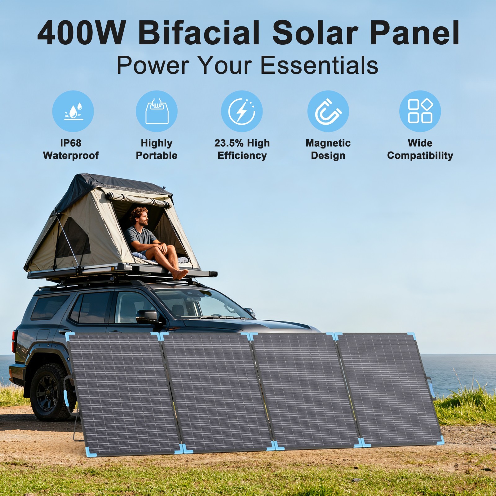 400W Bifacial Solar Panell for EcoFlow DELTA Pro 3600Wh Power Station Generator Key features and technical specifications of the E-POWO bifacial solar panel 400w: E-POWO bifacial solar panel is an innovative solar product with a unique dual-side design that allows it to capture sunlights from both the front and back surfaces, significantly increasing energy output. Compared to traditional monofacial solar panels, bifacial solar panels can harness more light energy with the help of reflected and scattered light, thereby improving overall power generation efficiency. 400W Bifacial Solar Power Generation: The E-POWO bifacial solar panel 400w captures light from both the front and back sides, increasing the total power generation of the system. Even under cloudy conditions or in environments with reflective surfaces, the back side of solar panel can still receive some lights, generating additional power. High Efficiency of 23.5% Conversion: The bifacial design of 400w solar panel makes effective use of light from the ground or other reflective surfaces, thereby improving power generation efficiency. E-POWO solar panels generally offer a 5%-30% efficiency increase compared to traditional monofacial panels. Durability of ETFE Material: Made from high-quality materials, the E-POWO 400W bifacial solar panel is highly resistant to harsh weather conditions such as strong winds, rain, and snow, offering excellent weather resistance and corrosion protection.E-POWO solar panel 400w is designed to withstand the harshest of weather conditions with an operating temperature range of -4℉ to 140℉ (-20℃ - 60℃). High-Quality Monocrystalline Cell Modules: Each panel is made with high-efficiency monocrystalline silicon solar cells, ensuring excellent conversion efficiency and long-term stability. Versatile Applications: Suitable for a wide range of installation environments,allowing for maximum space utilization.The E-POWO bifacial solar panel is a highly efficient, durable, and adaptable solar energy solution, offering increased energy output for residential, commercial, and large-scale solar power stations. Easy Installation with Aluminum Alloy Brackets: E-POWO bifacial solar panels 400 watt are typically designed with stands.E-POWO aluminum alloy mounting brackets are efficient and durable. With features like lightweight, corrosion resistance and wind resistance, these brackets provide stable support in various environments, ensuring the long-term efficient operation of solar panel. IP68 Waterproof Design :Constructed with ETFE laminated technology, E-POWO solar panel brings superior durability. The IP68 design protects solar panel in outdoor camping or trips.400W solar panels are highly reliable, efficient, and capable of withstanding a variety of environmental challenges. Various Compatibility with Power Stations :E-POWO’s MC4-Connection offers a superior solution for integrating solar panels with various power stations, ensuring a reliable and stable connection. E-POWO solar panel provides a simple, efficient, and adaptable way to power your devices with solar energy.It has wide compatibility for EcoFlow, Bluetti, Jackery, ALLPOWERS, or Anker Solix series power stations. Easy Folding and Go : When you're on the move, E-powo 400 watt solar panels can be easily folded for compact portability with weight of 11kg (24.2 lb).The handle guarantees a comfortable grip for your convenience.Solar Panell 400w can be easily packed up and carried with you, no matter where you go. 3 Type of Angles for Maximum Sunlights Absorption : You can maximize sunlight absorption by adjusting kickstand supports of solar panel. Easily switch between 30°, 45°, 60° angles.Kickstands are designed for easy setting and space saving in daily storage or travel trips. What's included? 400W Bifacial Solar Panel,User manual,7 in one Solar Charging Cable(Cable Length 1Meter/39.37in) Technical Specification Value Power Voltage 33.6 V Open Circuit Voltage 40 V Current 12 A Short Circuit Current 13.2 A Material ETFE Operating temperature -20℃ - 60℃ Cell Type Monocrystalline Cells Power 400 Watt Dimensions (Folded) 26.7*34.6*2.7 inch Dimensions (Unfolded) 96.4*34.6*0.6 inch Weight 11KG,24.2 lb Warranty 18 Months About E-POWO Delivery details Terms of Return Warranty Contact us About E-POWO E-POWO – Bringing you more environmentally friendly and cost-effective energy solutions! E-POWO is a high-tech enterprise specializing in the research, development, production, and sales of solar cleaning products and related peripherals. We are dedicated to reducing outdoor living costs and electricity bills through innovative products. As an industry-leading brand, we have long been committed to improving people's quality of life by providing efficient and reliable power solutions, backed by quality products and long-term after-sales support. We believe that through sustainable energy technologies, you can enjoy cleaner, more economical energy while contributing to the well-being of the planet. Choose E-POWO for a greener, smarter, and more energy-efficient life! Delivery details Fast Shipping from Los Angeles, California, USA We offer fast and reliable shipping via FedEx Ground, FedEx Home Delivery, and USPS Ground Advantage. Your package will typically arrive within 1 to 3 business days. If your order does not arrive within the estimated time frame, please reach out to us, and we'll promptly check the status of your package and assist with any logistics issues. Terms of Return 30-Day Returns – Money Back Guarantee We accept returns within 30 days of purchase. If you're not satisfied, please send message to us. We'll provide returning for a full refund. Returns are free for the buyer, and the seller will cover the return shipping label.Please ensure the item is returned with its original packaging. Warranty 18-Month Long-Term Warranty on Solar Panells We offer a 18-month warranty on all our solar panels to ensure your peace of mind. If y