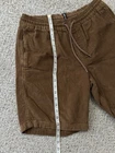 These Billabong men's size medium (32") dark brown corduroy dock shorts are a stylish and versatile addition to any preppy wardrobe. Featuring a drawstring closure for a comfortable fit, these shorts are perfect for travel and casual occasions during the warmer months. Made from a blend of polyester and cotton, they offer a mid-rise and a 9-inch inseam with a slash pocket for added convenience. With an elastic waist and drawstring detail, these shorts from Billabong provide a regular fit and are machine washable for easy care. Perfect for summer, fall, and spring, these shorts are a must-have for any man.