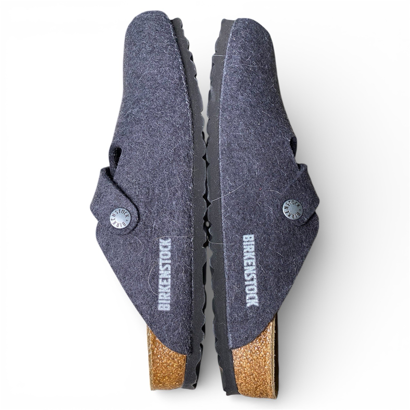 Item: Birkenstock Boston Wool Felt Clogs Color: Anthracite (Dark Grey) Size: EU 39 (US Women's 8 / US Men's 6) Width: Narrow Fit (Schmale Weite) Condition: New in Box with Tags Passes the "True Match" inspection for authentic, new condition. PLEASE NOTE: The original box shows signs of shelf wear, including crushed corners and tears on the lid (see photos). The shoes are in brand new, unworn condition. Elevate your comfort with these authentic Birkenstock Boston clogs. Featuring a high-quality wool felt upper in a versatile Anthracite Grey, these clogs offer a cozy yet breathable fit perfect for year-round wear. Key Features: - Upper: 100% Wool Felt (Tag: Textil) – Soft, durable, and naturally insulating. - Footbed: Original Birkenstock anatomically shaped cork-latex footbed (Classic/Firm support). - Sole: EVA – Flexible, lightweight, and shock-absorbing. - Adjustable Strap: Features a metal pin buckle for a custom fit. - Made in Germany. Sizing Note: This pair is a size EU 39. According to the box, this converts to a US Women's 8.0 or a US Men's 6.0. Please verify your Birkenstock size before purchasing, as these are the NARROW width fit. Includes original box and tags. Ships fast and securely!