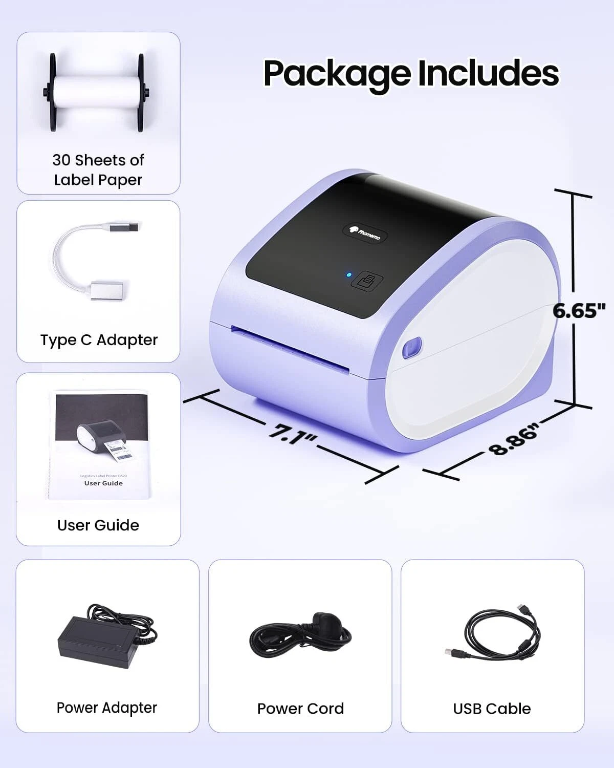 Phomemo D520-BT Bluetooth thermal shipping label printer. Product Overview - Brand: Phomemo - Model: D520-BT - Printing Technology: Thermal - Connectivity: Bluetooth and USB - Output: Monochrome - Maximum Print Speed: 150mm/s - Effective Print Width: 108mm - Printing Resolution: 203 DPI - Weight: 1.1kg - Dimensions: 175×218×157mm (L×W×H) Key Features 1. Large Built-in Paper Bin : - Equipped with a large inner paper bin, eliminating the need for a separate label holder. - Supports both fanfold and roll labels, providing flexibility in label choices. 2. Cost-Saving and Eco-Friendly : - Utilizes thermal direct technology, eliminating the need for ink or toner. - Provides a clean and environmentally friendly printing solution. 3. Wireless Printing : - Supports Bluetooth connectivity with smartphones and tablets via the "Labelife" app. - Compatible with iOS and Android devices. - Also supports USB connection for PC (Windows, Mac, Linux, Chrome OS), with driver installation required for PC printing. 4. Wide Platform Compatibility : - Compatible with major sales and shipping platforms like Amazon, eBay, Shopify, USPS, UPS, Etsy, etc. - Supports label widths from 1 to 4.6 inches, suitable for both fanfold and roll labels. - High printing speed of up to 72 labels per minute, enhancing work efficiency. 5. Advanced Technology : - Equipped with the latest AF chip and high-tech thermal print head for stable and high-quality printing. - Easy and simple operation, suitable for printing documents, photos, and more. Setup Instructions for Chrome OS 1. Connect the printer to the computer using a USB cable and turn on the printer. 2. Open the Chrome Web Store and search for "Labelife". 3. Add the Labelife extension to your Google Chrome browser. 4. Open the Labelife extension, click "Add" to discover the printer, and configure the settings. 5. Open the file you want to print in Google Chrome, press "Ctrl + P" to open the print interface, select the printer, and start printing. Benefits - Convenience : Wireless connectivity and compatibility with multiple devices and platforms make it easy to print labels on the go. - Efficiency : High printing speed and compatibility with various label types and widths ensure smooth workflow. - Cost-Effective : No need for ink or toner, reducing operational costs. - Versatility : Suitable for a wide range of applications, including e-commerce, logistics, and office environments. This printer is an excellent choice for businesses and individuals looking for a reliable, efficient, and cost-effective solution for printing shipping labels.