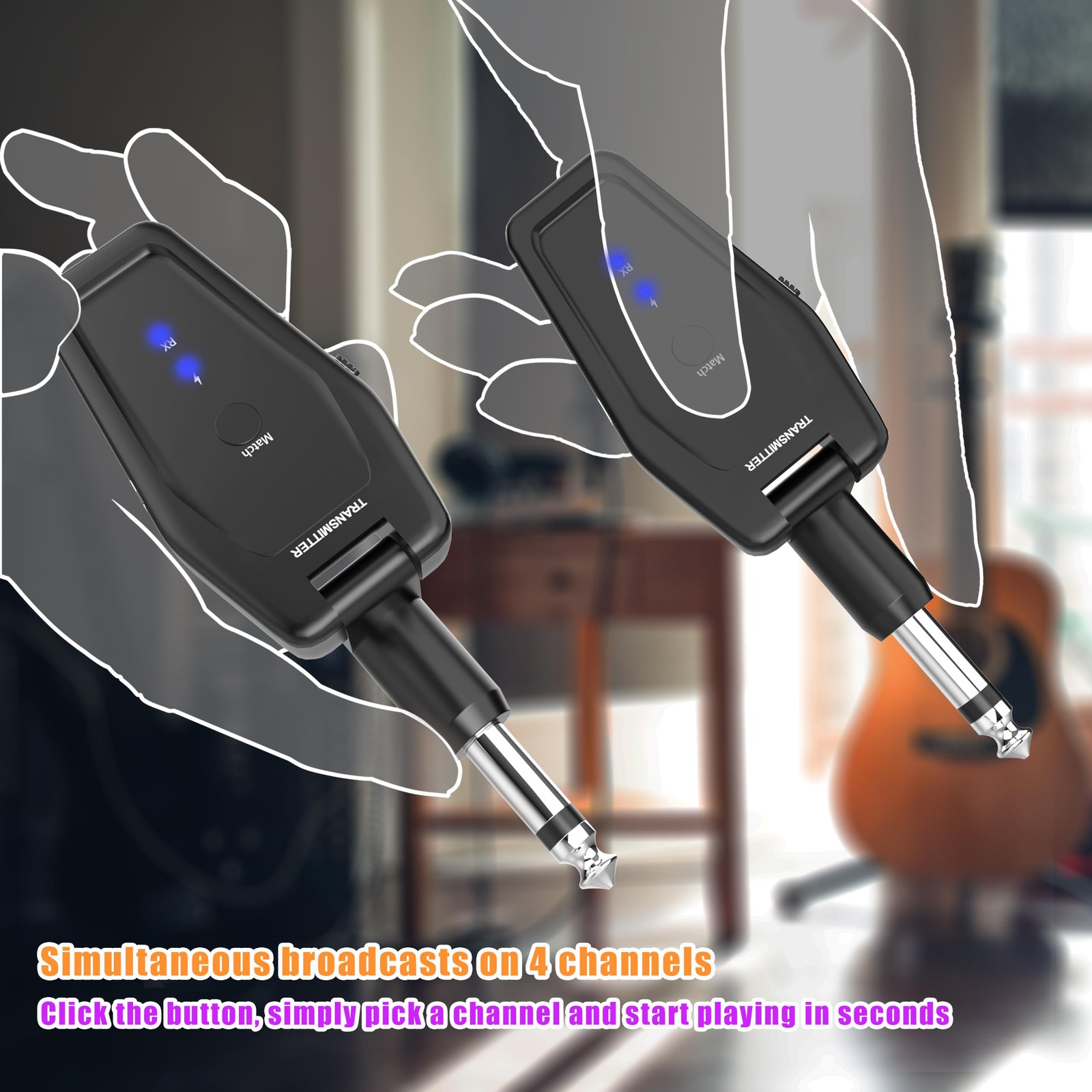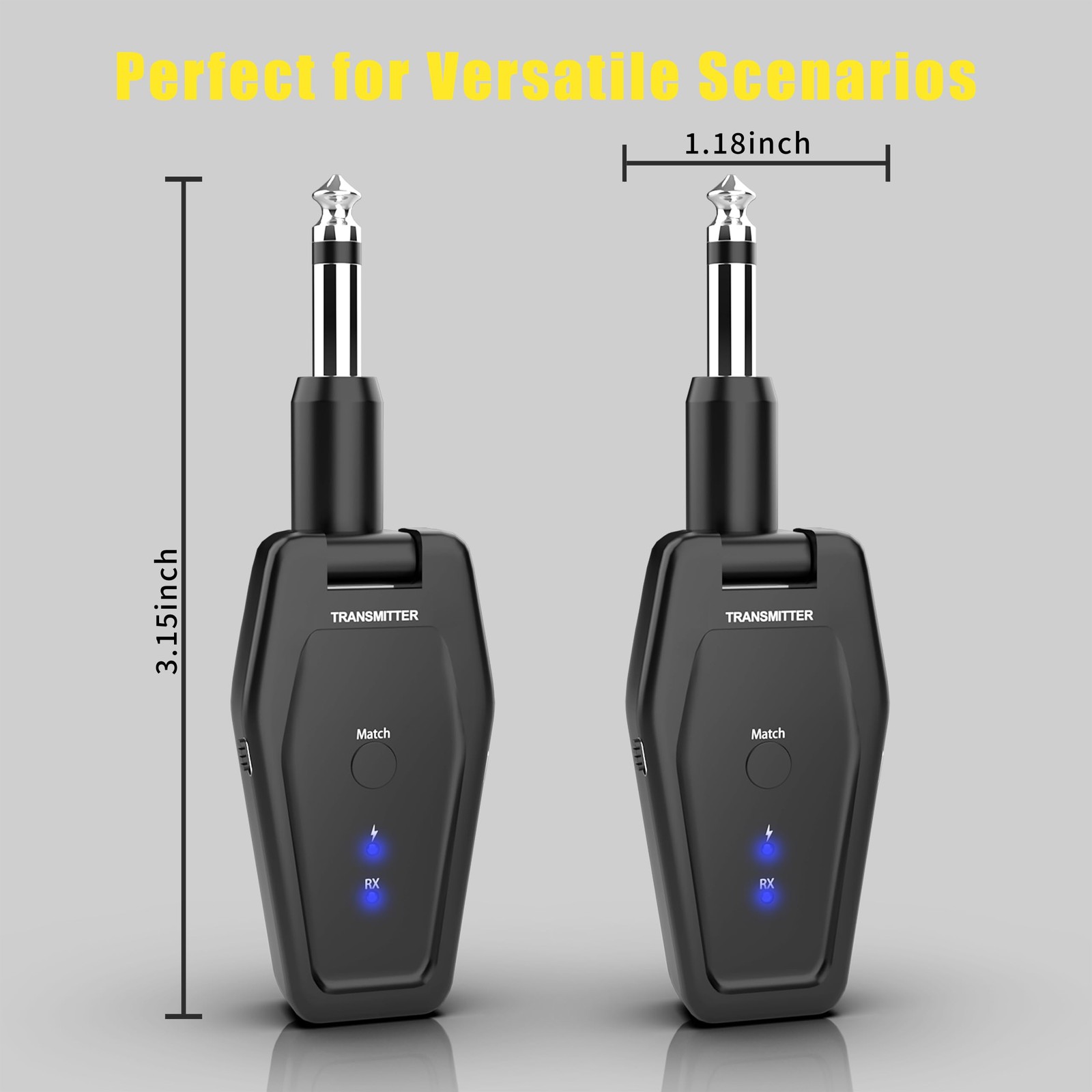 Guitar Wireless System: Bluetooth Guitar Transmitter Receiver with 50m Transmission Range - Audio Wireless Transmitter Receiver for Electric Guitar, Bass, and Other Electric Instruments 🎸【Enhanced Wireless Connectivity】: Experience uninterrupted audio transmission with ourBluetooth guitar transmitter receiver, offering a reliable 50m transmission range and UHF wireless transmission technology. Say goodbye to interference and enjoy clear 24-bit audio with <0.5 TDH distortion. 🎸【Versatile Usage and Compatibility】: Our wireless transmitter receiver is designed for various applications, including instrument teaching, street performances, and more. With its universal 6.35mm audio interface, it's compatible with electric guitars, bass guitars, and other electric instruments. 🎸【Convenient and Easy-to-Use】: Enjoy hassle-free setup with our plug-and-play design - simply connect the transmitter and receiver for automatic pairing. The transmitter features a 220° rotatable design for easy angle adjustment, while its mini size and foldable 6.35mm plug ensure portability and convenience. 🎸【Long-lasting Battery Life】: Break free from the constraints of cables with our long-lasting battery. With up to 5 hours of continuous use, you can rely on our wireless system for extended performances without worrying about power issues. 🎸【High-Fidelity Audio Performance】: Immerse yourself in high-fidelity audio with our wireless transmitter receiver. Featuring a wide frequency response range of 30Hz to 18kHz and a high signal-to-noise ratio of >90dB, our system delivers clear and stable audio transmission for an exceptional performance experience.