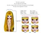 Blythe Doll Matte Face Yellow Black Hair Change Eyes Nude 12" BJD Toys OOAK Gift There are just Limited quantity available! Get yours NOW before we run out!!! Step into a world of creativity and magic with our stunning 12-inch Blythe doll! Perfect for collectors and doll enthusiasts, this Blythe doll is ready to captivate hearts with her unique charm and endless possibilities for customization. Features: ✨ Expressive Eyes: Four different eye colors and positions with a simple pull of a string, reflecting her many moods and styles. 👗 Customizable Beauty: Change her hair, makeup, and style to create a doll that’s uniquely yours. 🌈 Premium Quality: Crafted from durable, high-quality materials to ensure she stands the test of time. 📏 Perfect Size: At 12 inches tall, she's the ideal size for both play and display. Why You'll Love Our 12" Blythe Doll: Endless Creativity: Perfect for photography, crafting, and artistic projects, she’s a blank canvas for your imagination. Community Connection: Join a worldwide network of Blythe enthusiasts who share your passion and creativity. Unique Gift Idea: A thoughtful and personalized gift for birthdays, holidays, or any special occasion, sure to delight both children and adults. Bring home the magic of the 12" Blythe doll today and dive into a world where imagination knows no bounds. Embrace the charm, creativity, and joy that only a Blythe doll can offer. Order now and let the adventures begin! Dolls are selling in nude, Not including clothes and accessories.