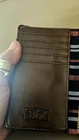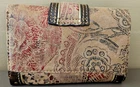 Estate sale find...original tags still inside but there is some minor scuff marks from storage, tried to show in last photo, nothing big, but had to mention. Super soft bohemian style floral print with a brown croc embossed trim , and bronze metal studs. Inside fabric is a multicolor navy striped pattern. Has a cute heart shaped clear pocket Measures closed - 5.5" x 4" Measures open - 10" x 5.5" Lots of pockets!! Please see pictures for best description