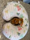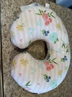 Elevate your nursing experience with the Boppy Nursing Pillow Original Support. This U-shaped pillow is designed to provide comfort and support during breastfeeding sessions. Its multicolor design features flowers and light pink stripes that add a touch of elegance to your feeding routine. Crafted with machine washable materials, this pillow is easy to clean and maintain. Its MW3/1-2667 location ensures that you can easily find it wherever you go. Perfect for mothers who want to add a touch of style to their nursing routine, this Boppy Nursing Pillow is a must-have. Used twice. It has an extra black cover with stars. It comes from a smoke free home.