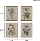 Add a graceful botanical charm to your home decor with the Botany Set Framed Linen Canvas 4 Piece Set. A wild flower is beautifully displayed on each of the framed linen canvas for a cottage-inspired look. A D-ring fixtures on the back of each frame makes each botanic wall art easy to hang. Display this framed linen canvas set together or separately to give your living room, kitchen, or bedroom a soft natural allure. PANEL SIZE - 4 CANVAS 17. 84"W X 21. 84"L X 1. 45"H (4) PANEL SIZE - 4 CANVAS 17. 84"W X 21. 84"L X 1. 45"H (4) LIFESTYLE - Modern classic multi color home decor Each framed wall art features a wild flower is beautifully displayed on each of the framed linen canvas for a cottage-inspired look. The wall decor features beautiful framed linen canvas. It's the perfect hanging decoration of contemporary art to add to your living room or home office decor MATERIAL - High quality painting with added sophistication of linen canvas ideal for professional office environment. D-rings on each piece for ease of hanging PLACEMENT - This modern classic wall decor is very versatile. The calm and neutral color hue and its natural allure made this accent piece to blend easily with both casual room setting or professional office environment. This accent decor would be the simple solution to add sophistication to your current decor. CARE - Spot clean only do not use bleach or any harsh solution to maintain original color quality