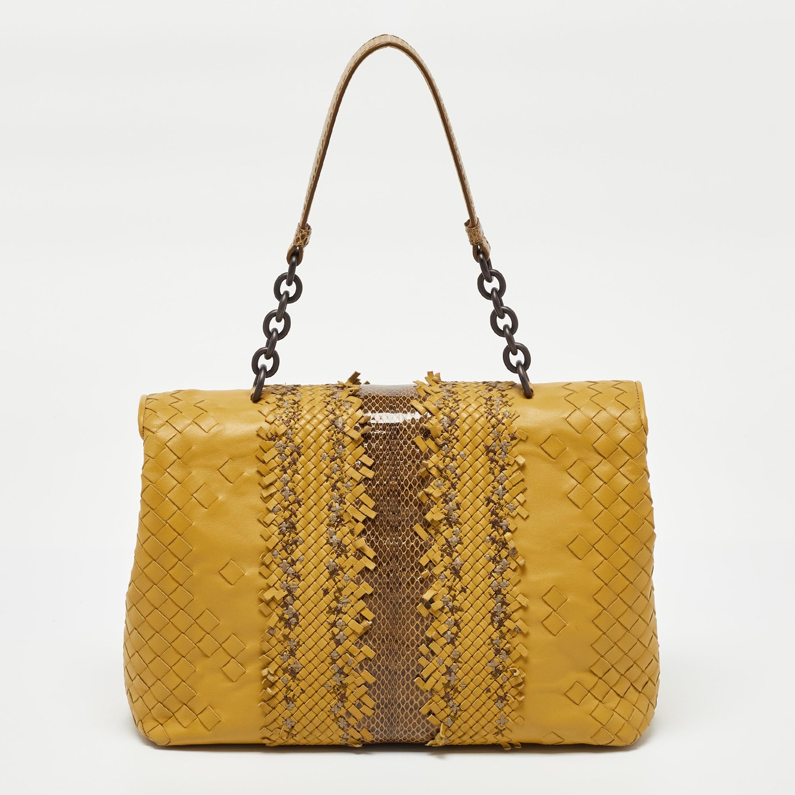 Designer bags are ideal companions for ample occasions Here we have a fashion meets functionality piece crafted with precision. It has been equipped with a well sized interior that can easily fit your essentials.Certified by The Luxury Closet - This item has gone through a detailed authentication process overseen by our experts. We offer a lifetime guarantee of authenticity on all our items. Import duties, taxes and charges are not included in the item price. These charges are the buyers responsibility. Please check with your country’s customs office to determine what these additional cost will be prior to buying. Our eBay Store About Us Contact Us Add to Favorite Sellers Bottega Veneta Yellow/Brown Intrecciato Leather and Watersnake Olimpia Shoulder Bag $713.9 Designer bags are ideal companions for ample occasions Here we have a fashion meets functionality piece crafted with precision. It has been equipped with a well sized interior that can easily fit your essentials. Product Details Brand Color Yellow Dimensions Height: 20 cm, Width: 11 cm, Length: 28 cm Material Leather Size Outsole Width Outsole Length Heel Height Includes Original Dustbag, Original Box, Info Booklet, Mirror Certified by The Luxury Closet This item has gone through a detailed authentication process overseen by our experts. We offer a lifetime guarantee of authenticity on all our items. How We Check The in-house team of experts at The Luxury Closet is highly trained to verify the authenticity and the condition of the luxury products. They ensure that only 100% authentic items are put on sale.The evaluation process is unique with its own mix of assessment criteria and differs according to the category. Each item is evaluated based on the following combination of hallmarks, hardware, stitching, symmetry, material, craftsmanship, stamping, codes, hologram stickers, and packaging. Our authenticators also check if the items have been modified or amended (e.g., aftermarket diamonds, replaced batteries, repaired bags, etc.) International Buyers Import duties, taxes and charges are not included in the item price. These charges are the buyers responsibility. Please check with your country’s customs office to determine what these additional cost will be prior to buying.