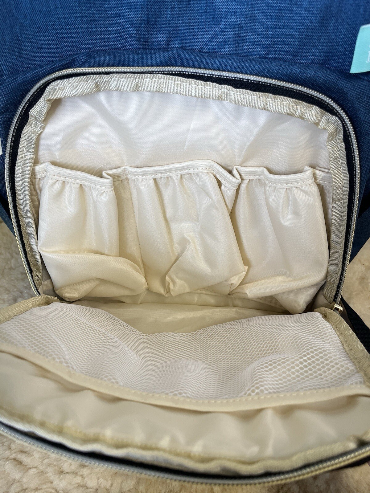 This is a large navy blue A.F.B.P. insulated diaper bag backpack featuring numerous sections, a monogrammed design, and an adjustable strap. The bag is designed with a waterproof and water-resistant material, along with a zipper closure to keep items secure. It is suitable for both baby travel and everyday use, with its insulated thermal lining to keep bottles and snacks at the desired temperature. This unisex bag offers convenience and functionality with its versatile design and features. Like new condition Dimensions: 16x11x5 Ships fast from a smoke free home