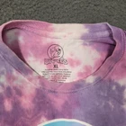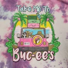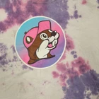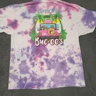 Show your love for Buc-ee's with this vibrant tie-dye T-shirt. Featuring a playful cartoon beaver design, it's perfect for casual outings and comfortable wear. • Size: XL • Material: 100% Cotton • Color: Purple, Pink • Front and back graphics • Crew neck • Short sleeves • Machine washable Minor discoloration on the front. Top to bottom = 29 inches.