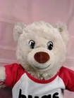 There is some pilling on the shirt. This adorable white plush bear from Build-A-Bear Workshop comes with a cozy Hugs T-Shirt, perfect for snuggling up with. The bear stands at 15 inches tall and has beautiful brown eyes. Made from soft polyester material, this original Build-A-Bear is perfect for any bear lover. As part of the Build-a-Bear franchise, this plush bear is a must-have for any collector or fan. It was manufactured in 2021 and is an original piece. The bear is in excellent condition and ready for a new home. Don't miss your chance to add this cute and cuddly bear to your collection!