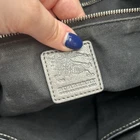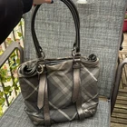 Comes with a certificate of authenticity. Burberry Tote • Grey Canvas • Smoked Check Pattern • Silver-Tone Hardware • Leather Trim • Dual Shoulder Straps • Leather Trim Embellishment • Canvas Lining & Three Interior Pockets • Snap Closure at Top • Protective Feet at Base Shoulder Strap Drop: 7.75" Height: 10.75" Width: 10.5" Depth: 5.25" Very good condition. Item is preowned and vintage. Please refer to all photos, some markings at interior.