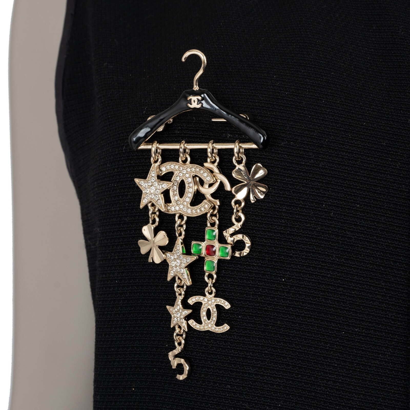Welcome to LUX l Authentic Designer Consignment Rämistrasse 25, 8001 Zürich, Switzerland I Tue-Fri 11-18:30 & Sat 11-16:00 By bidding on our auctions you are agreeing to our Terms and Conditions below. All items come with authenticity guarantee! ------------------------------------------------------------------------------------------------------------------------------------------ Product Description: This 100% authentic Chanel Clothing Hanger brooch in gold-tone metal and black resin is a dazzling statement piece adorned with symbolic charms. Featuring strass-encrusted stars, a four-leaf clover, the number 5, an interlocking CC, and a striking green and red Gripoix glass cross, it embodies the house’s rich heritage and playful elegance. A rare and collectible accessory that adds a touch of Chanel’s signature charm to any look. Has been worn and is in excellent condition. 2023 Paris-Monte Carlo Resort Measurements Model 23C Tag Size One Size Width 4.7cm (1.8in) Length 10cm (3.9in) Hardware Beige Gold-Tone All our listings include only the listed item unless otherwise specified in the description above - Price does not include import duties & taxes - check your countries import laws prior purchase ------------------------------------------------------------------------------------------------------------------------------------------ Terms & Conditions Luxury-Shops is not affiliated with any of the name-brand items we offer for sale. Warranties and Liabilites: Luxury-Shops declines all responsibility and cannot be held liable for any damages caused by the use of a specific garment. We also cannot be held responsible for the quality of an item (we are not the manufacturer) or any damages resulting from a manufacturing defect. No warranties of any kind are given or implied. Condition of Merchandise: Luxury-Shops offers for sale luxury top-quality products. We fully disclose the condition of each item. In the description of each product, Luxury-Shops will specify the conditions if different from the standards set by the market (Required disclosure of prior use) The main characteristics of products are shown in great detail (through numerous photographs and in-depth descriptions). The products offered for sale MAY NOT correspond to the real garments in terms of image and color because of the Internet Browser or Monitor used (color calibration). Luxury-Shops disclaims all responsibility. Every used item offered by Luxury-Shops has been cleaned and restored to the best possible condition unless noted otherwise. Every used or vintage handbag has been polished and refinished. Your purchases will be sent to you ready to be used or worn. Please be aware that vintage items may be delicate and may not be as resilient as a brand-new item. Please take appropriate care when using a vintage item. Damage to items after receipt or use by customers is not the responsibility of Luxury-Shops. Luxury-Shops is a reseller of authentic designer and vintage merchandise. We are not an authorised dealer and are not affiliated with the brands we sell on our site. Store-new designer items are only available from an authorised dealer or the actual store. Once the item leaves the authorised dealer with a customer, the item is considered pre-owned. However, items can be pre-owned and in new condition - that is, never used by the owner. Below are the definitions of the descriptions we use. NEW : in new condition, that is, never used . This means the item may have been purchased by us from an authorized dealer or a store. New items may also be pre-owned, that is, purchased by one of our consignors and never used. These items may have minor signs of handling as would any item available at an authorized dealer or boutique given that customers would reasonably handle an item when trying it on or examining it for purchase. USED: the item has been carried or worn and may be in any of the conditions described below. PRISTINE/VIRTUALLY NEW : Appears to have been used only a handful of time and is nearly new in condition. May have very slight signs of having been used upon close inspection. EXCELLENT : Used and in top condition. There may be faint signs of wear, slight scratches, marks or nicks which are not particularly noticeable and will not affect the use or wear of the item. Our descriptions and photographs will clearly indicate the condition of the item. GOOD : Used, may be an older or well-loved item. There may be slightly more noticeable signs of wear, scratches or marks. These will not affect the wear or use of the item. Our descriptions and photographs will clearly indicate the condition of the item. VINTAGE : Typically around 20 to just under 100 years old. Our vintage items are carefully examined and selected. Most are gently or rarely used, meticulously stored or cared for and will come to you in a perfectly usable condition. However, these are unique items which may be of a finer and more delicate nature than brand-new items so please be sensitive to this and have reasonable expectations of their resilience. We do not make allowances for unreasonable expectations in the condition of our items. Product Descriptions: We make every effort to display the products featured on our web site as accurately as possible, using a large array of unaltered digital photographs and detailed descriptions. Our examination and assessment of merchandise is meticulous and conducted with great attention to detail. Our expertise and product knowledge comes from many years of experience with authentic designer and vintage items. We make as much effort as is humanly possible to disclose all relevant information required for you to be completely confident about your purchase. However, the display and colour capabilities of your computer monitor could affect the colours you see on the screen and these may differ from the actual product. Luxury-Shops is not responsible for monitor limitations and cannot guarantee that a monitor's display
