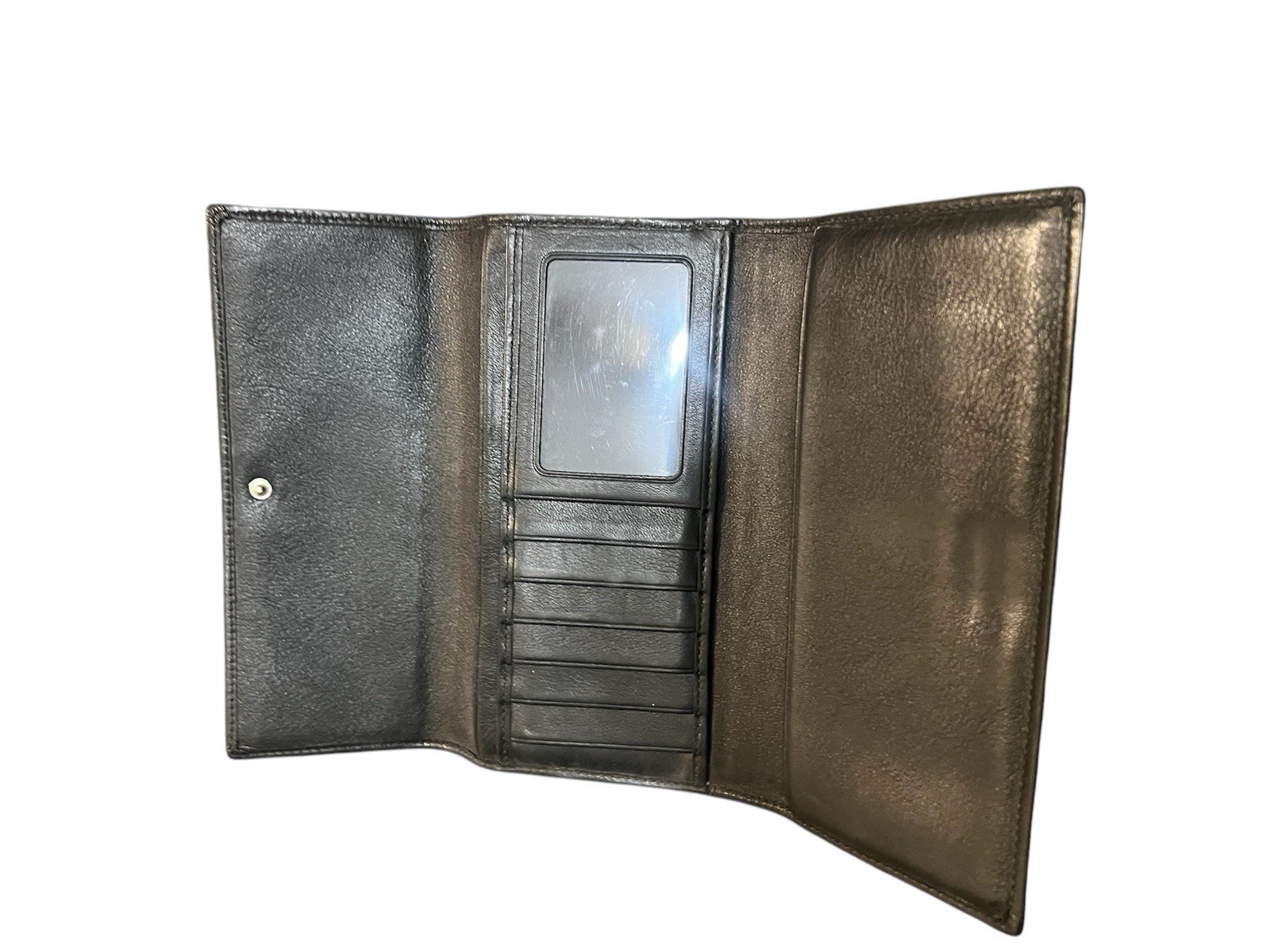 Experience the blend of sophistication and functionality with this COACH Black Leather Wallet. A versatile accessory designed to keep your essentials organized, this trifold wallet folds smoothly, revealing a neat arrangement of credit card slots, a coin compartment, a pen holder, an ID card window, and a checkbook area. Accented with a sleek zipper detail, the wallet's checkered pattern exudes a timeless elegance. Crafted from premium leather, the wallet measures 8 inches in length and 4.5 inches in width, making it an ideal size for everyday use without being bulky. Its classic black color ensures it matches any outfit, making it a must-have for those who appreciate both style and practicality in their accessories.