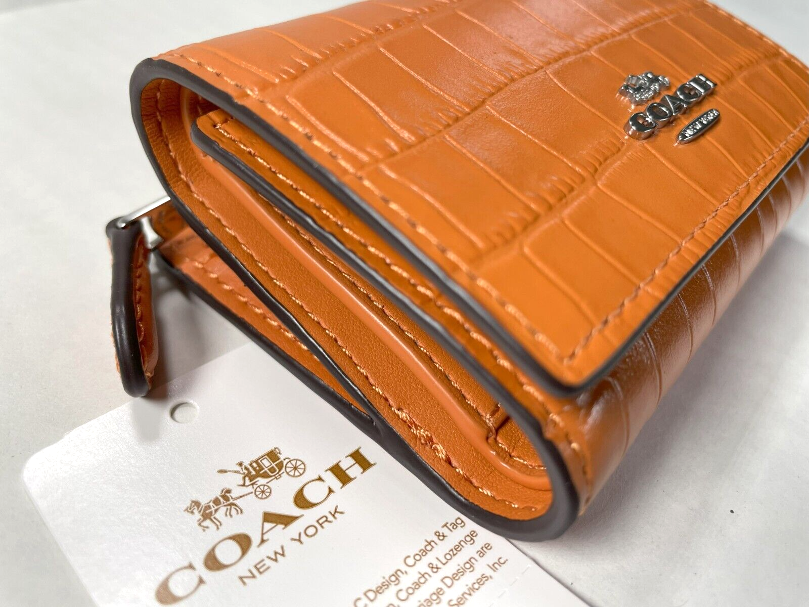 COACH CU914 Crocodile-embossed Leather Micro Wallet New with original price tag Absolutely Authentic! MSRP: $218.00 Color: Washed Orange Style: CU914 Description: Crocodile-embossed leather and smooth leather Front logo metal, in silver tone Snap closure Zip coin pocket Three credit card slots Full-length bill compartment Length: 4 inches Height: 3 inches Width: 1.25 inch Please let me know if you have any questions. Comes from a smoke free house. -------------------------------------------------------------------------------------------------------------- Your purchase will be shipped in 24 hours once payment is received and verified. You will be notified of the shipping date via E-Mail -------------------------------------------------------------------------------------------------------------