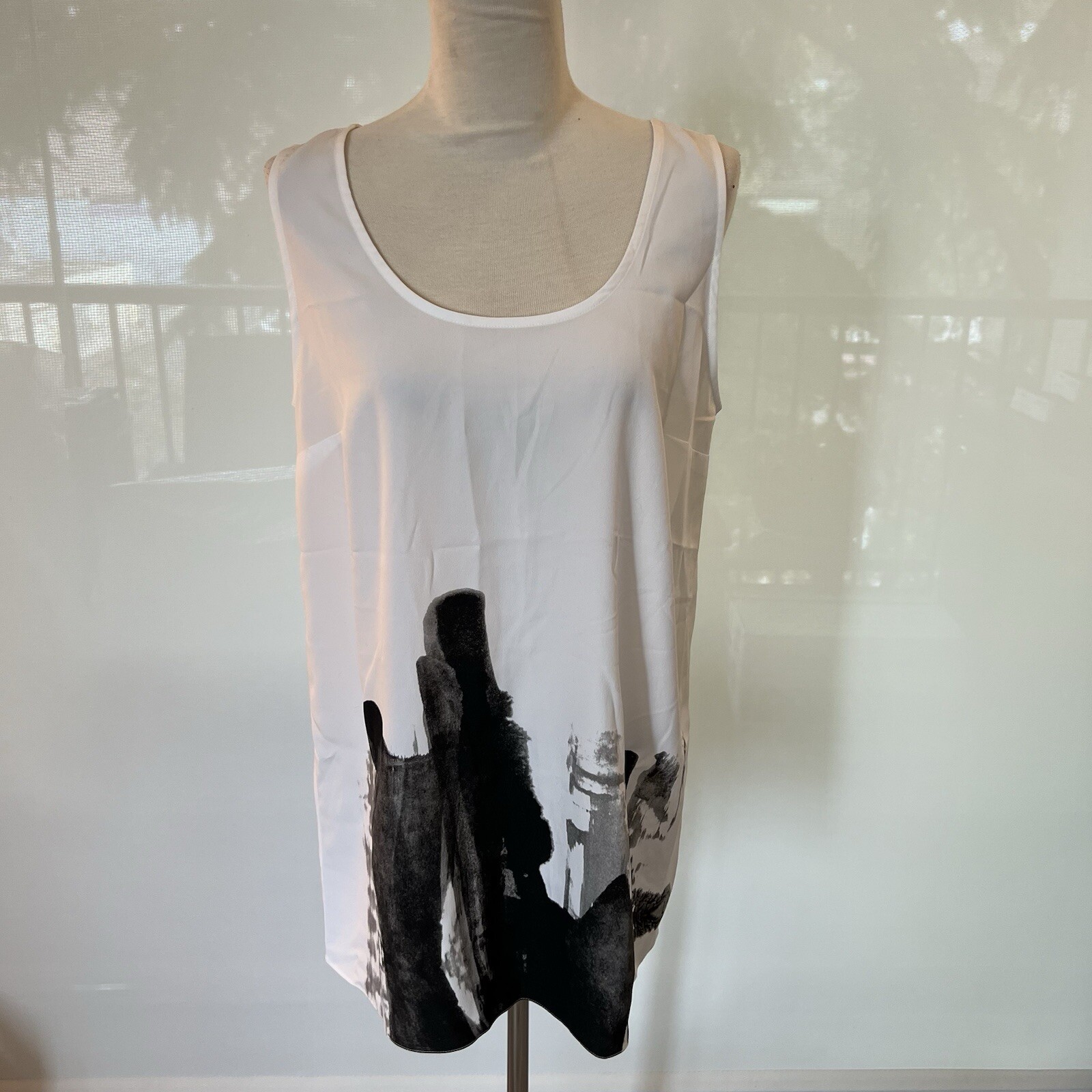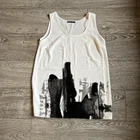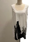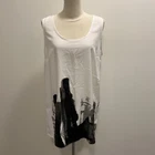 CREA CONCEPT White Tank Top with Cityscape Graphic - Sleeveless Lagenlook Tunic, approximate Size Large Experience urban chic with this CREA CONCEPT white tank top featuring a black and grey cityscape graphic. The artistic design feels hand-painted, adding a unique touch to this sleeveless lagenlook tunic. Enjoy a relaxed fit with artisan styling in Excellent Used Condition (EUC). Details: - Brand: CREA CONCEPT - Style: Sleeveless Lagenlook Tunic - Color: White with black and grey cityscape graphic - Fabric: Feels like a modal blend, recommend dry cleaning - Fit: Relaxed - Neckline: Crew Neck - Artisan Lagenlook Styling Additional Information: - EUC with no size, care or fabric tag - Size: Approximate size large - Measurements (lying flat): - Pit to Pit: 19" - Shoulder to Hem: 29" - Pet-free, smoke-free home - Cross-posted - Questions and offers are welcome - Bundle deals available for great savings Express your style with this CREA CONCEPT tank top, a perfect blend of artistic flair and lagenlook sophistication. Elevate your wardrobe with this one-of-a-kind piece!