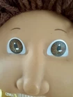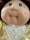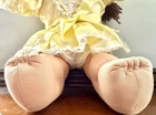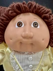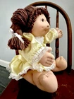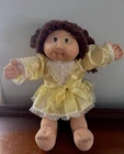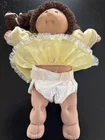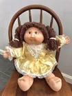 Beautiful & clean 1985 Cabbage Patch Kids girl doll with brown braids and looped bangs, medium complexion, original yellow satin Cabbage Patch Kids dress and diaper. In great condition, several small pulls in doll body fabric. Shoes are not included. Packaged thoroughly and carefully for safe delivery.