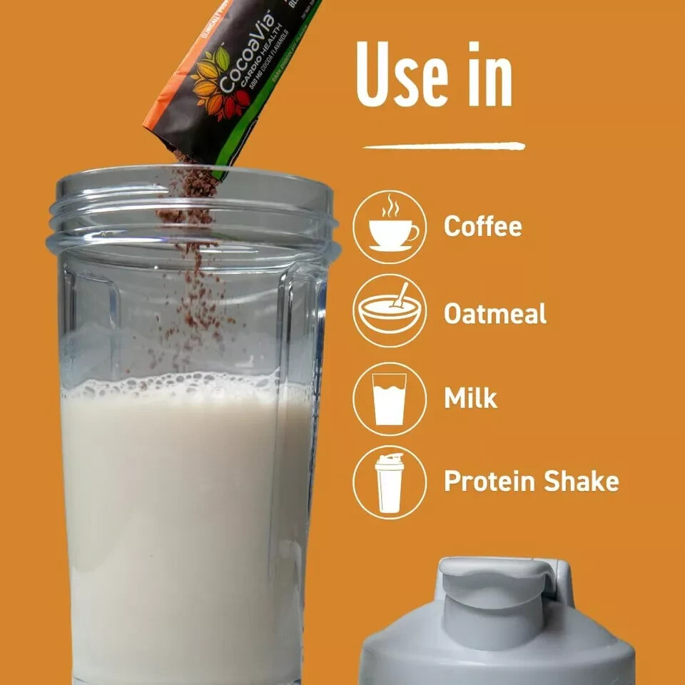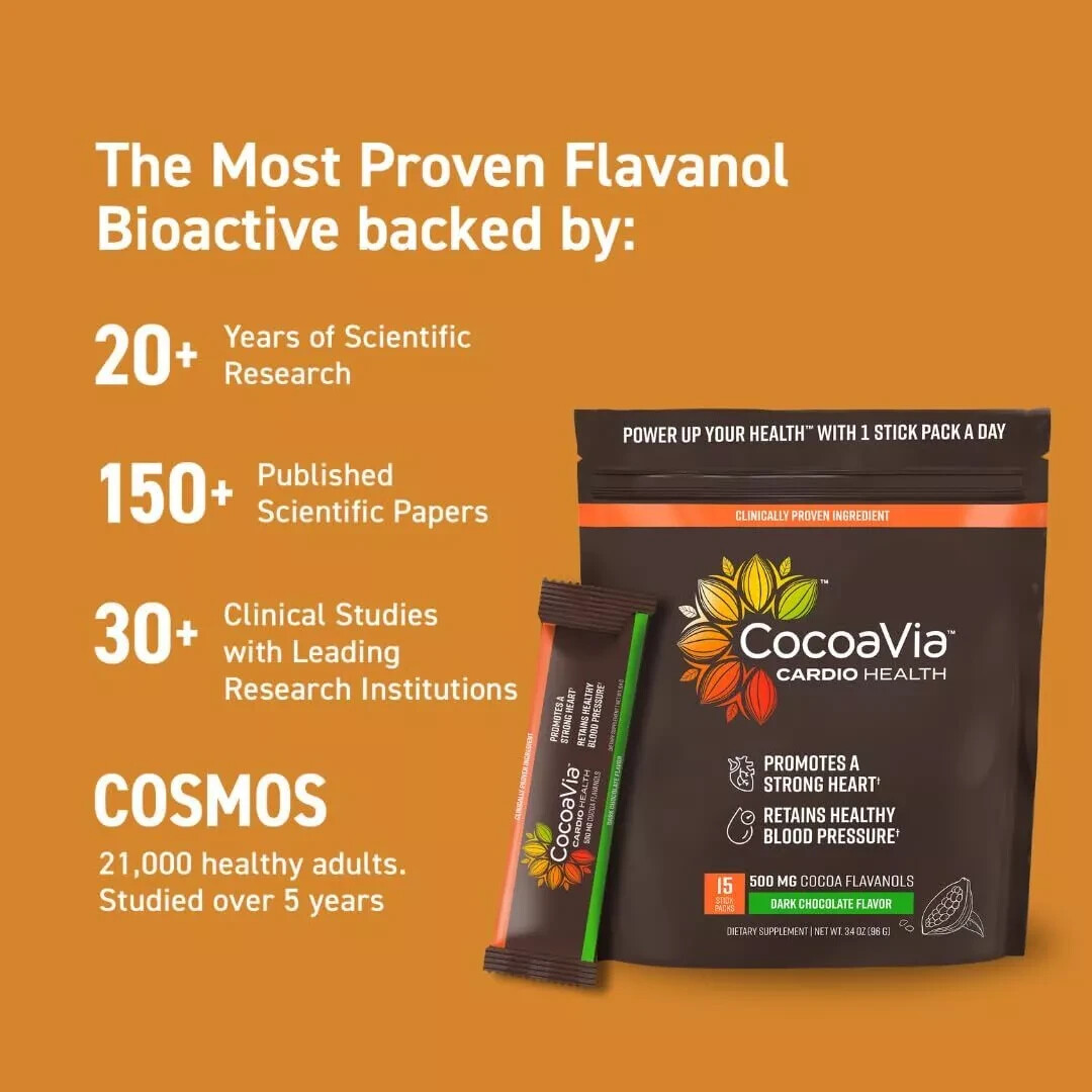 Support your cardiovascular health with a boost in circulation that starts from day one. Better blood flow helps deliver the oxygen and nutrients your body needs, which promotes vascular health. 's Ingredient has been clinically proven in the largest Flavanol study. A 5-year Harvard-led Clinical trial with more than 21,000 participants. The Cocoa Flavanol in (Cocoapro) is the #1 proven Bioactive ingredient (Per COSMOS Study, 2022).MOST CONCENTRATED COCOA FLAVANOL PRODUCT* – Tested & Verified by Consumer Labs. Each serving of our concentrated Cocoa Extract, contains 500 mg of Cocoa Flavanols. CLINICALLY PROVEN RESULTS - Backed by more than 20 years of Scientific Research, 30 plus Clinical Studies, and 150 Published Scientific Papers. Cocoa Flavanols are one of the most researched plant-based nutrients. PROMOTES A STRONG HEART & CARDIOVASCULAR HEALTH - Helps improve vascular elasticity and arterial function, and blood flow. NITRIC OXIDE SUPPLY BOOSTER - Cocoa flavanols increase nitric oxide output, a super molecule that enhances circulation by making arteries more flexible. This results in a boost of oxygen supply through heart, muscles and brain. PROMOTES A STRONG HEART & CARDIOVASCULAR HEALTH - Helps improve vascular elasticity and arterial function, and blood flow. MOST CONCENTRATED COCOA FLAVANOL PRODUCT* – Tested & Verified by Consumer Labs. Each packet contains 500 mg of Cocoa Flavanol and also delivers 30 mg of naturally occurring caffeine. Cocoa Flavanols work best when taken daily. *Among 46 Cocoa Products. CONVENIENT - Take these single serve packs on the go - to the gym, the office, on a bike ride and for travel. Add to your protein shake, coffee, smoothies or oatmeal.