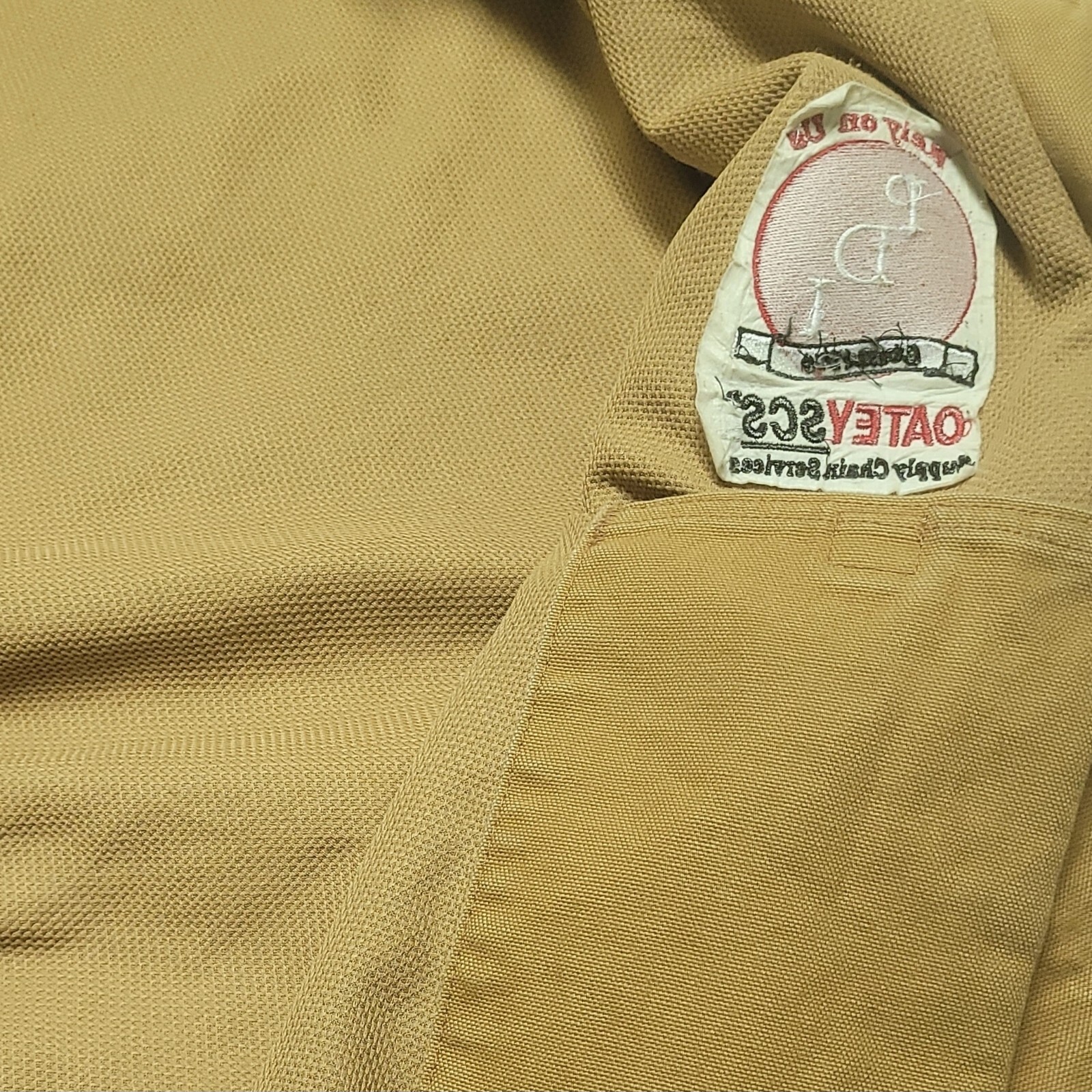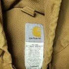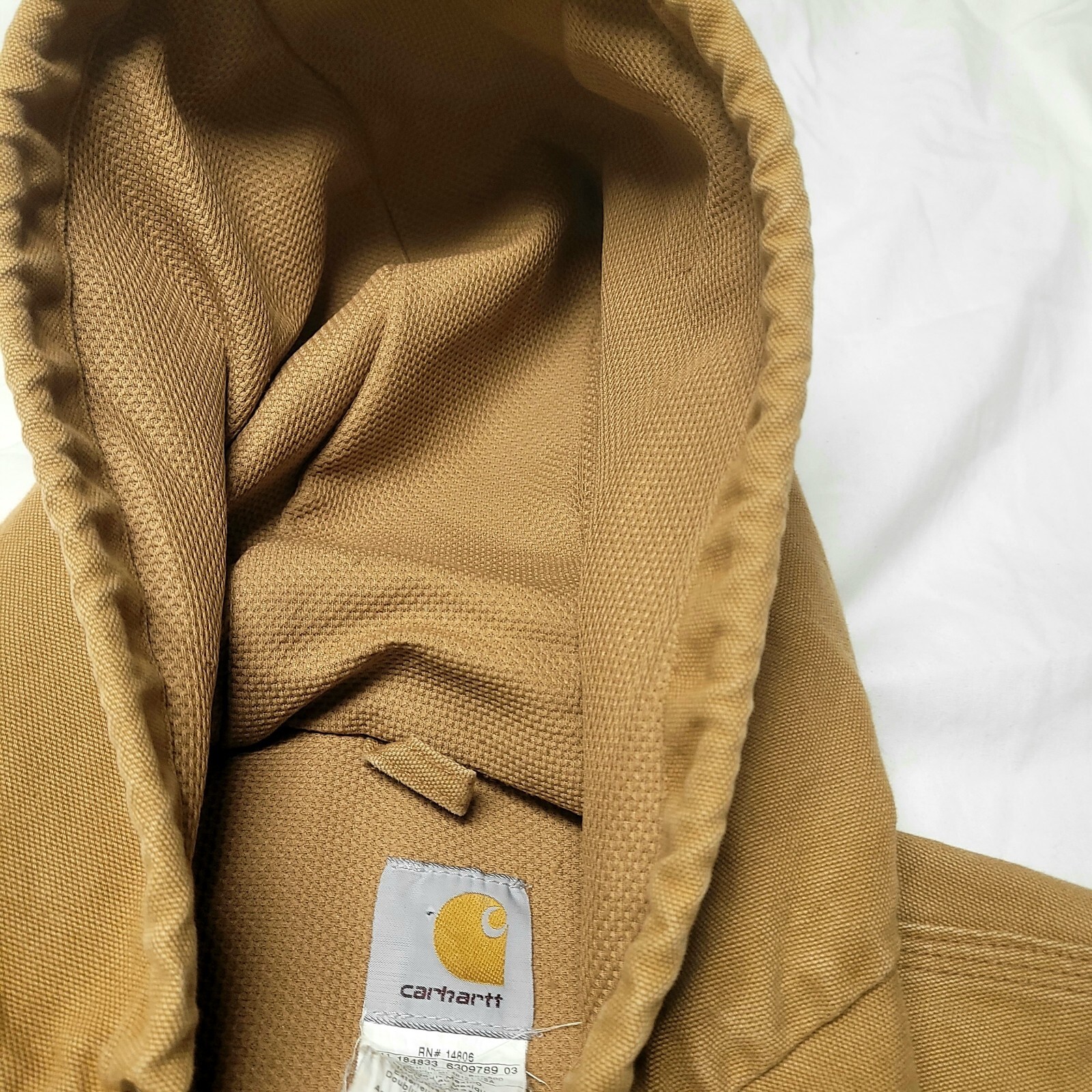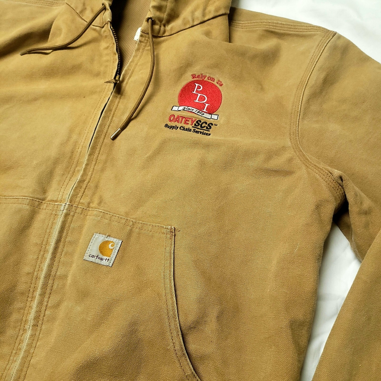 This Carhartt jacket is a versatile addition to any wardrobe, perfect for travel, casual wear, or work. Made of durable cotton, it features a solid pattern and mid-length coat for a stylish look. The jacket has a zip and drawstring closure, with a quilted design accented by a hood for added warmth. This men's L size jacket is machine washable, with a brown color and polyester lining. The Carhartt j131 product line is suitable for walking, hunting, and hiking, making it an ideal choice for outdoor activities in any season. The jacket is a regular fit and comes from the brand known for quality workwear. It comes to you in good pre-owned condition and ready to wear. It has a nice distressed look and is embroidered with a PDI logo and scripting. We have several pictures posted so you can see the exact jacket you're getting.