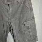 These Carhartt Rugged Cargo Shorts are designed for both casual and workwear occasions. They feature a relaxed fit, a mid-rise style with a 10-inch inseam, and a waist size of 33 inches. Made from a durable cotton blend fabric with a touch of spandex for added comfort, these gray shorts have a flat front design with a zip closure and button accents. The cargo pockets provide extra storage space, making them practical for outdoor activities. The Carhartt logo adds a touch of branding to these versatile and machine washable shorts.
