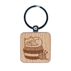 Cat Sleeping on Basket of Yarn Knitting Engraved Wood Square Keychain Tag Charm